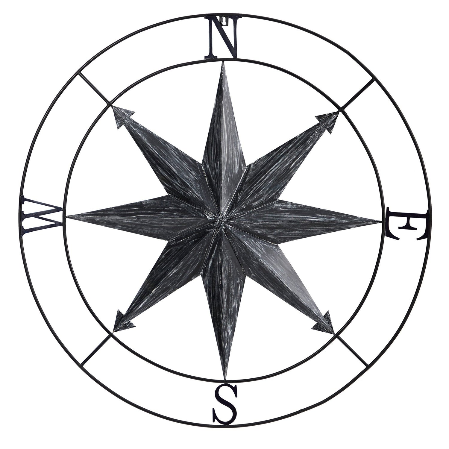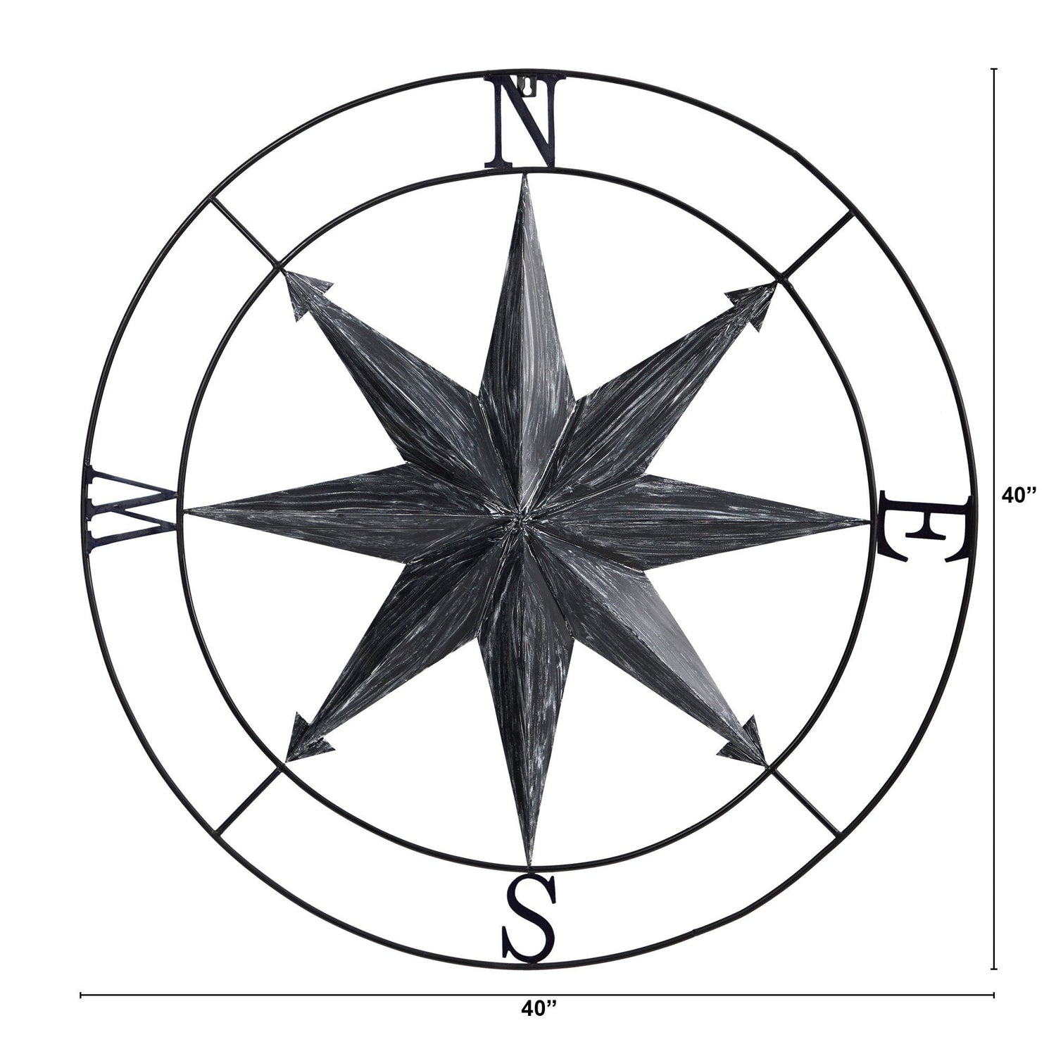 Enhance your coastal décor with this Nautical Metal Compass Wall Art Décor. Metal in a washed finish is in a circular shape; enclosed is a star pointing at the cardinal directions. Be the captain of your home by bringing ocean vibes to any space. Standing 40", easily hang in any large room. Looks great in a bathroom, bedroom, guest room, or a coastal-inspired kitchen. Complements many style decors.