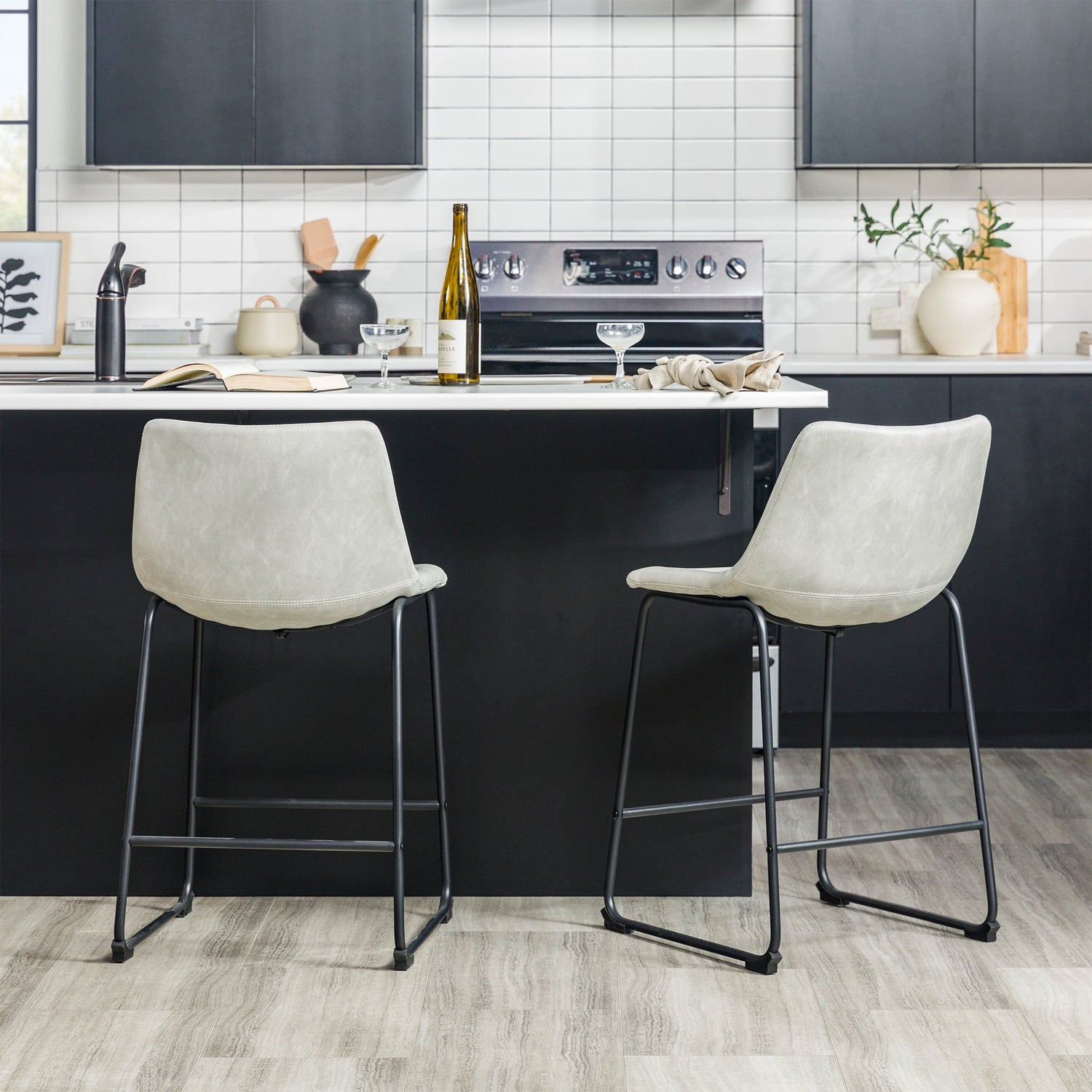 Elevate your kitchen with this set of 2 faux leather counter stools, crafted for both style and comfort. The soft synthetic leather upholstery combines with ergonomically curved seats, delivering a refined yet inviting feel. Powder-coated steel legs ensure durability and stability, seamlessly blending industrial aesthetics with versatile design that complements various interiors.