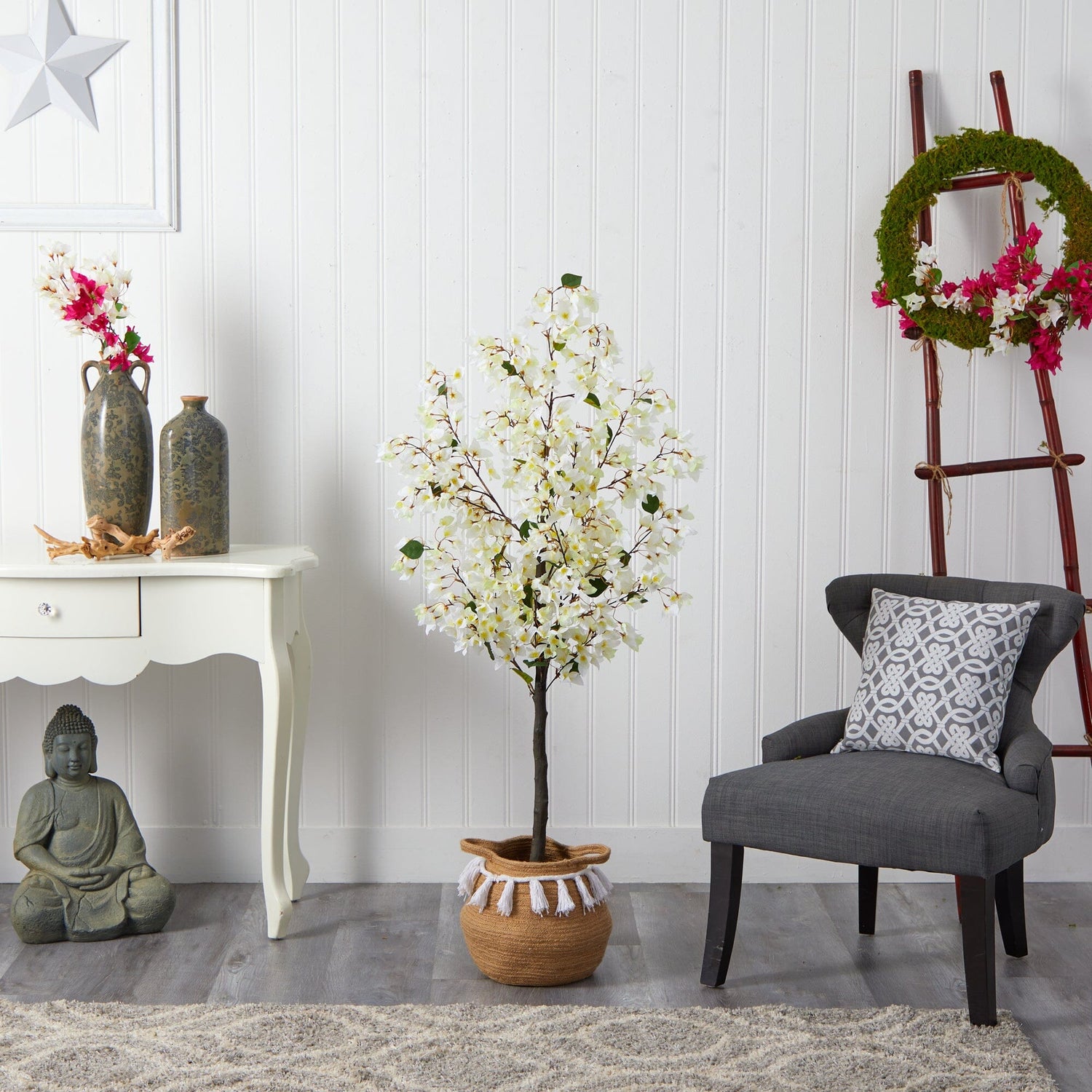 5’ Artificial Bougainvillea Tree with Handmade Jute & Cotton Basket with Tassels