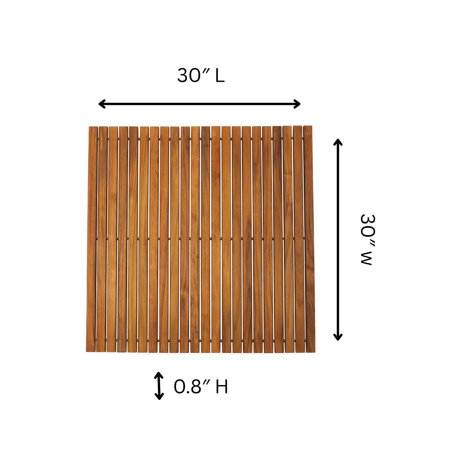 Treat your bathroom, patio, RV or just about anywhere you’d like with an upscale look with this smooth teak wood string mat. Twenty two 30 inch teak wood slats are held together by aluminum strings for easy rolling and portability. The premium finish of this eco-friendly mat ensures lasting functionality for indoor and outdoor settings alike.