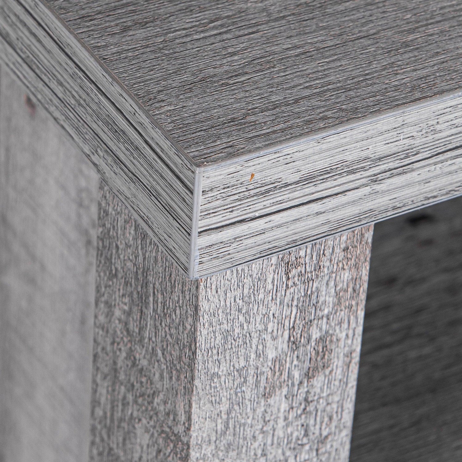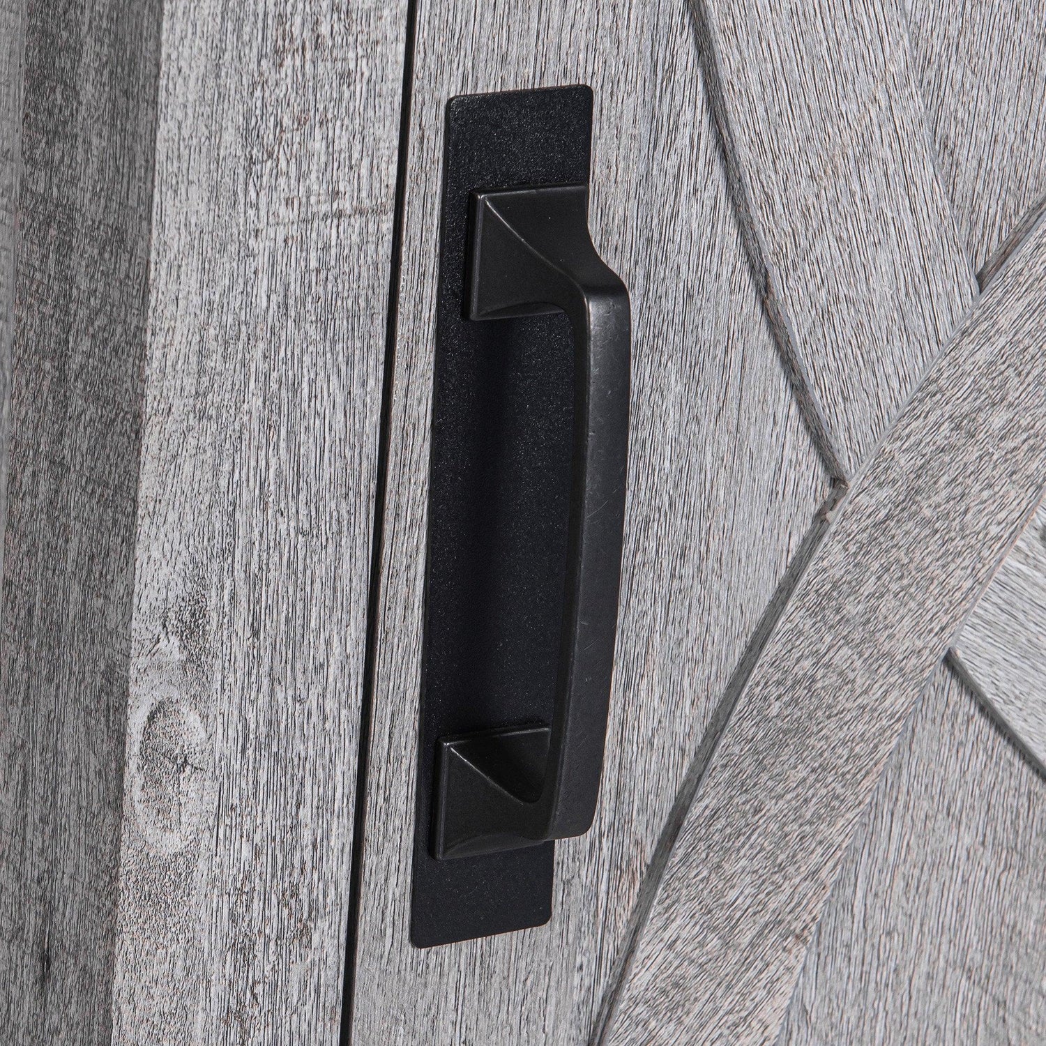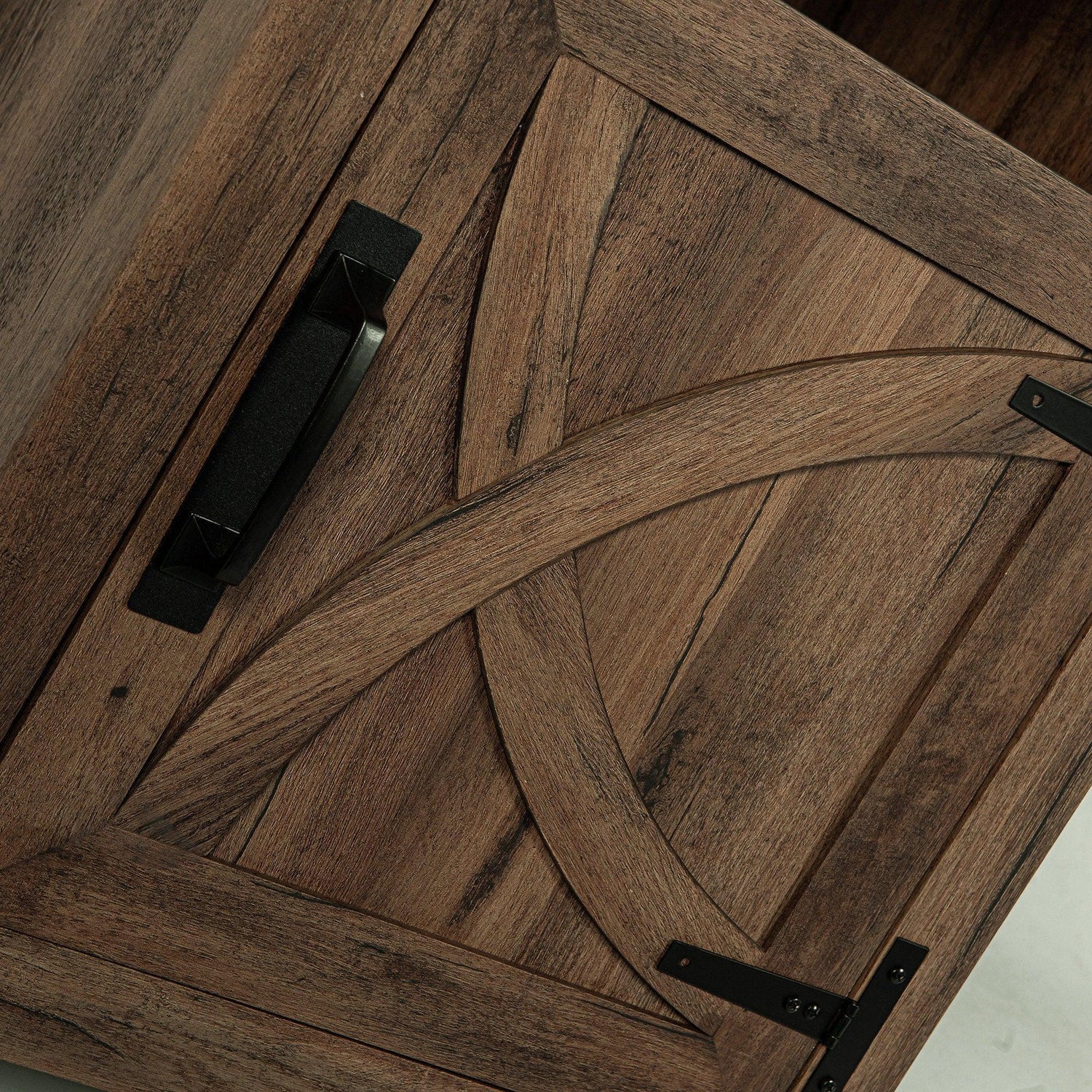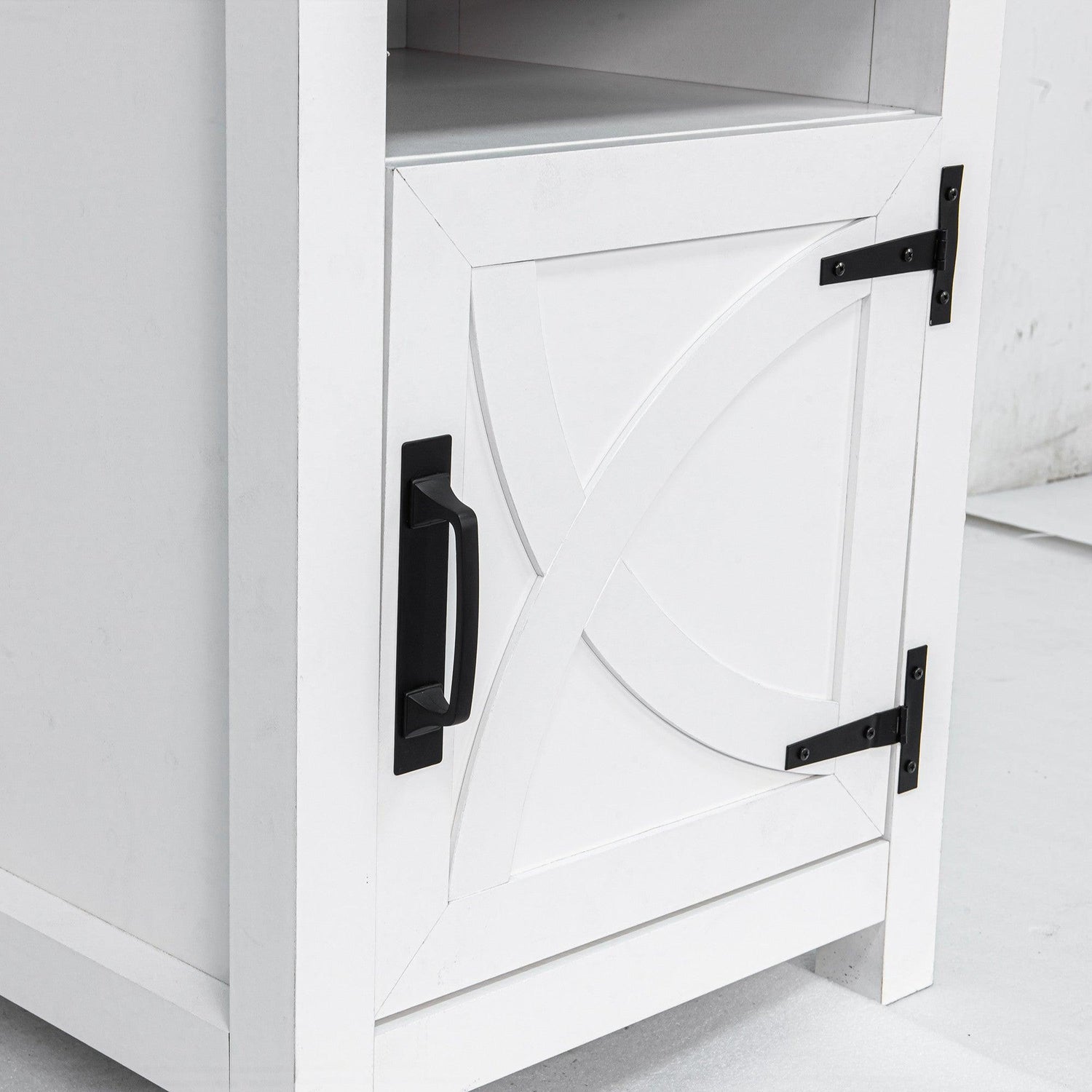 This nightstand features a rustic brown or grey finish and brings farmhouse style and versatile functionality to any room. Crafted from wood art with distressed paint, it offers a vintage, weathered look. Barn door cabinets and open compartments provide storage to help keep spaces organized.