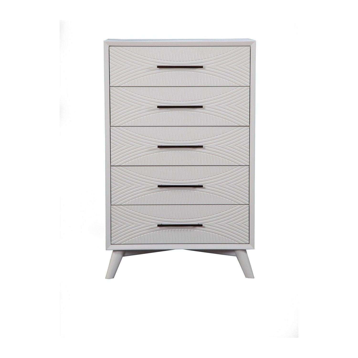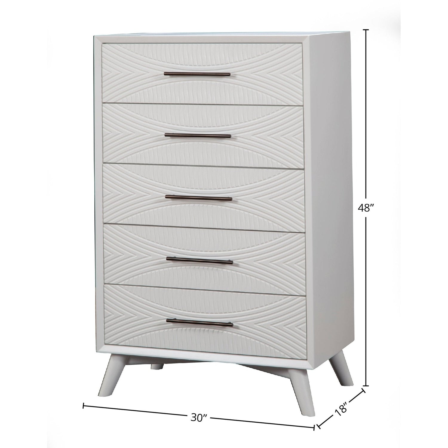 This chest features a classic white finish and is crafted with mahogany wood solids and veneer. It offers five drawers for storage, with French and English dovetail drawer construction and felt-lined top drawers. Ball bearing metal drawer glides ensure smooth operation, and the chest comes fully assembled.
