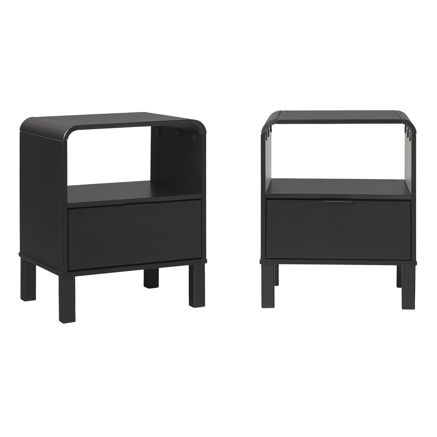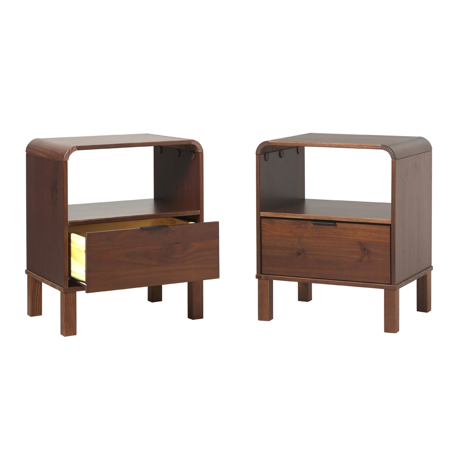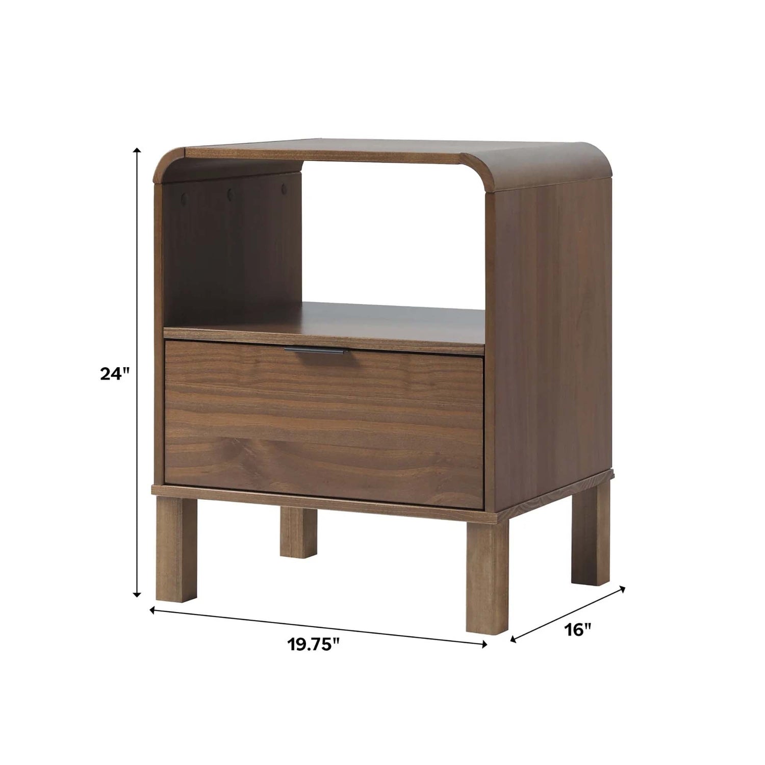 The Elias Modern Curved-Frame Nightstand features a solid wood construction with a smooth, curved frame that enhances its modern aesthetic. Designed for both form and function, it includes an open cubby for display and a drawer for discreet storage, making it a refined addition to any bedroom.