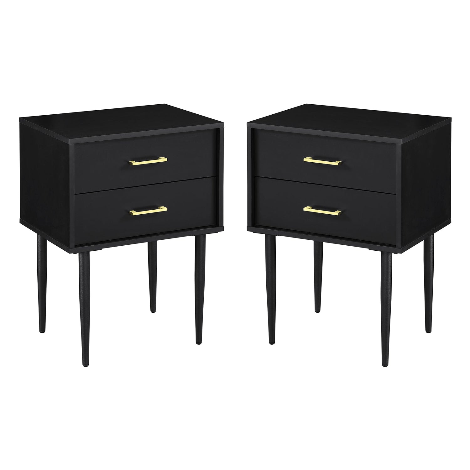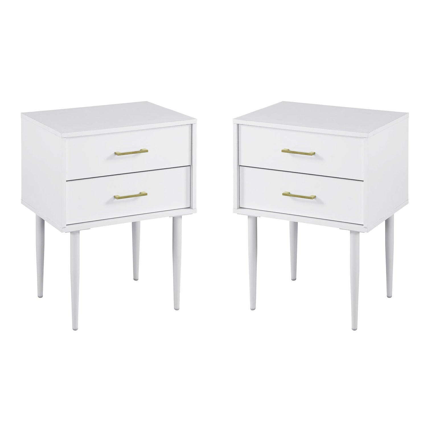 This Olivia Two-Drawer Nightstand set features a refined Mid-century modern design with tapered legs and gold-accented handles that introduce a subtle contemporary edge. Crafted from warp-resistant MDF wood with a durable laminate finish, these nightstands combine form and function seamlessly, providing practical storage while enhancing any bedroom, home office, or sitting area with clean lines and timeless appeal.