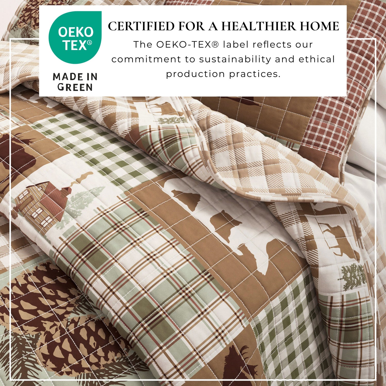 This charming lodge-themed quilt set adds a touch of the great outdoors to your bedroom. Featuring detailed prints of trees and woodland animals paired with complementary plaids, this reversible quilt set brings a rustic and cozy feel to any space. Crafted with attention to durability and an ease of machine-washability, this quilt set is perfect for families, guests, kids, and pets. Its lightweight warmth and versatile style ensure comfort throughout every season, making it an ideal addition to your home decor. Experience the cozy embrace of nature right in your bedroom.