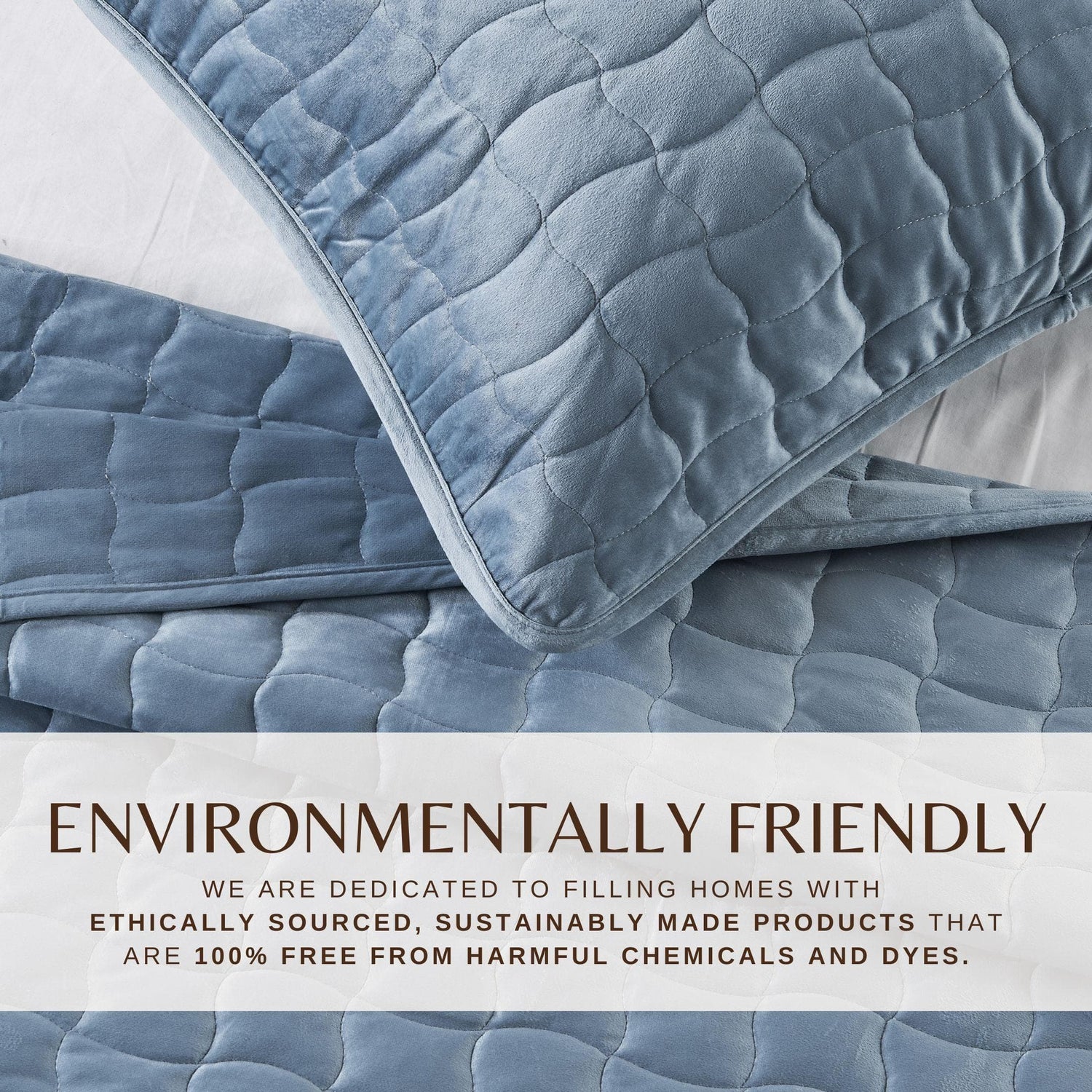 Decorate your bedding with a rich velvet box-stitched quilt set. The box stitching ensures the fill will stay in place, while the velvet fabric featured on both sides of this quilt offers a heavyweight, cozy warmth. The dual-sided velvet and matching shams create a sumptuous feel and lavish style, offering an all-around luxurious experience. Add elegance and comfort to your bed for year-round styling. This quilt set is made free of harmful chemicals and dyes, creating a luxe and comforting experience.