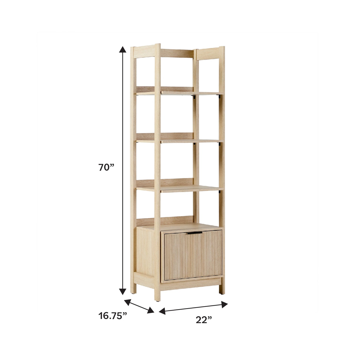 The Holmes Modern Scandinavian Reeded Bookshelf features a refined design accented by reeded detailing, crafted from durable MDF and laminate for lasting stability. Its slim profile maximizes vertical storage, while the spacious lower drawer with a pull tab offers discreet space for essentials, making it ideal for compact areas. This bookshelf blends seamlessly into living rooms or home offices, balancing form and function with understated elegance.