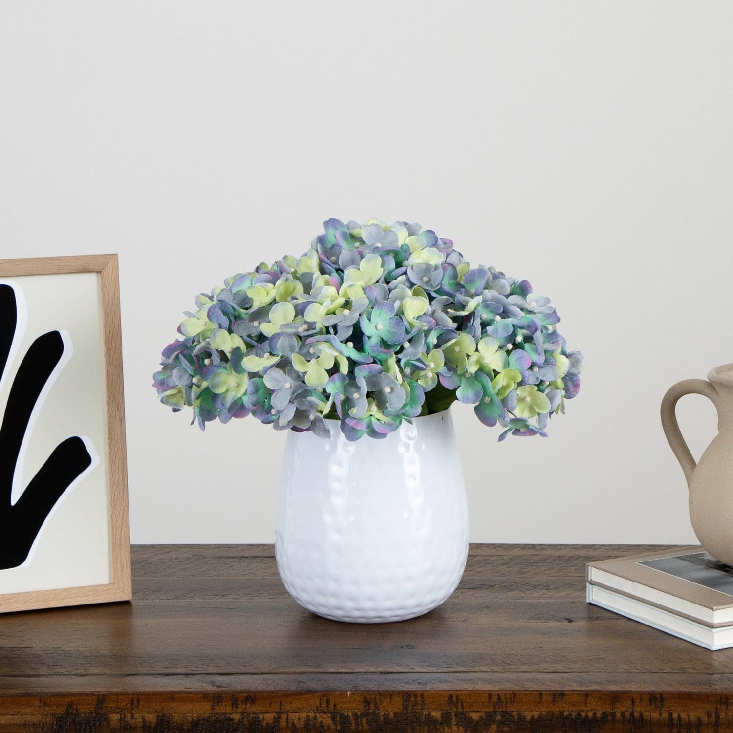 11” Artificial Hydrangea Arrangement in White Metal Vase