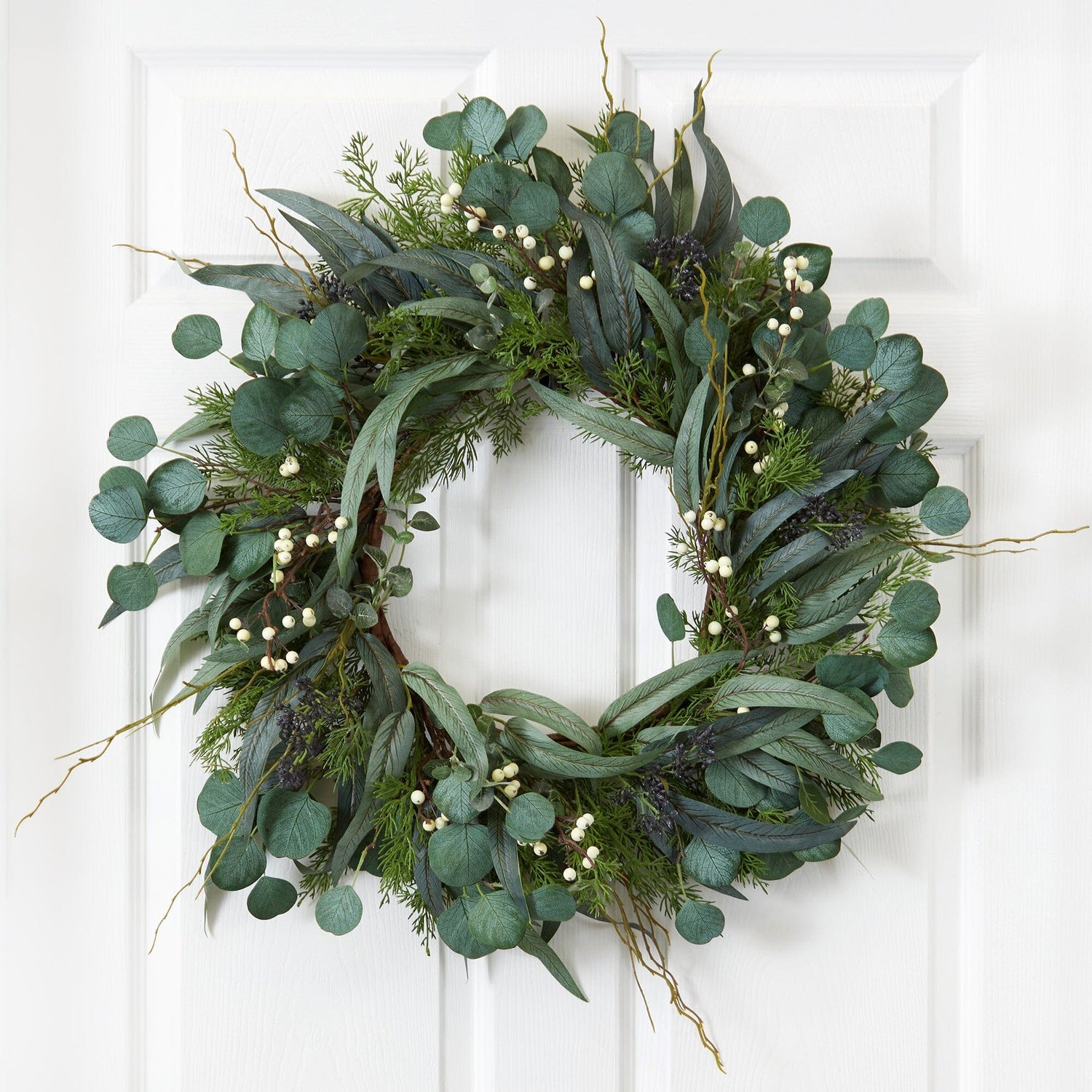 A combination of several lush green leaves, dotted with dainty white berries, makes up this artificial eucalyptus wreath. With its luxurious greenery, this versatile piece will look perfect in any settings, no matter what time of year it is. You can hang it in your living room or on a bedroom door and complement it with your personalized door sign.