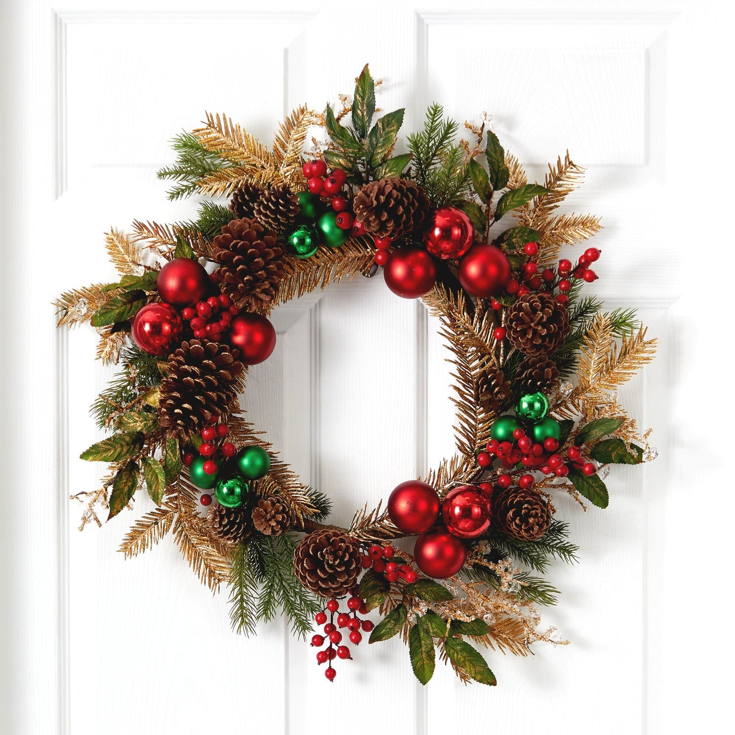 Deck the halls with a seasonal holiday wreath that showcases glimmering ornaments and a mix of decorative gold and green pine leaves. Bundled to perfection, handcrafted faux florals are intricately placed for a life-like appearance. Hang atop the mantel with candles and figurines for a showstopping display or table top at the entryway to greet guests.