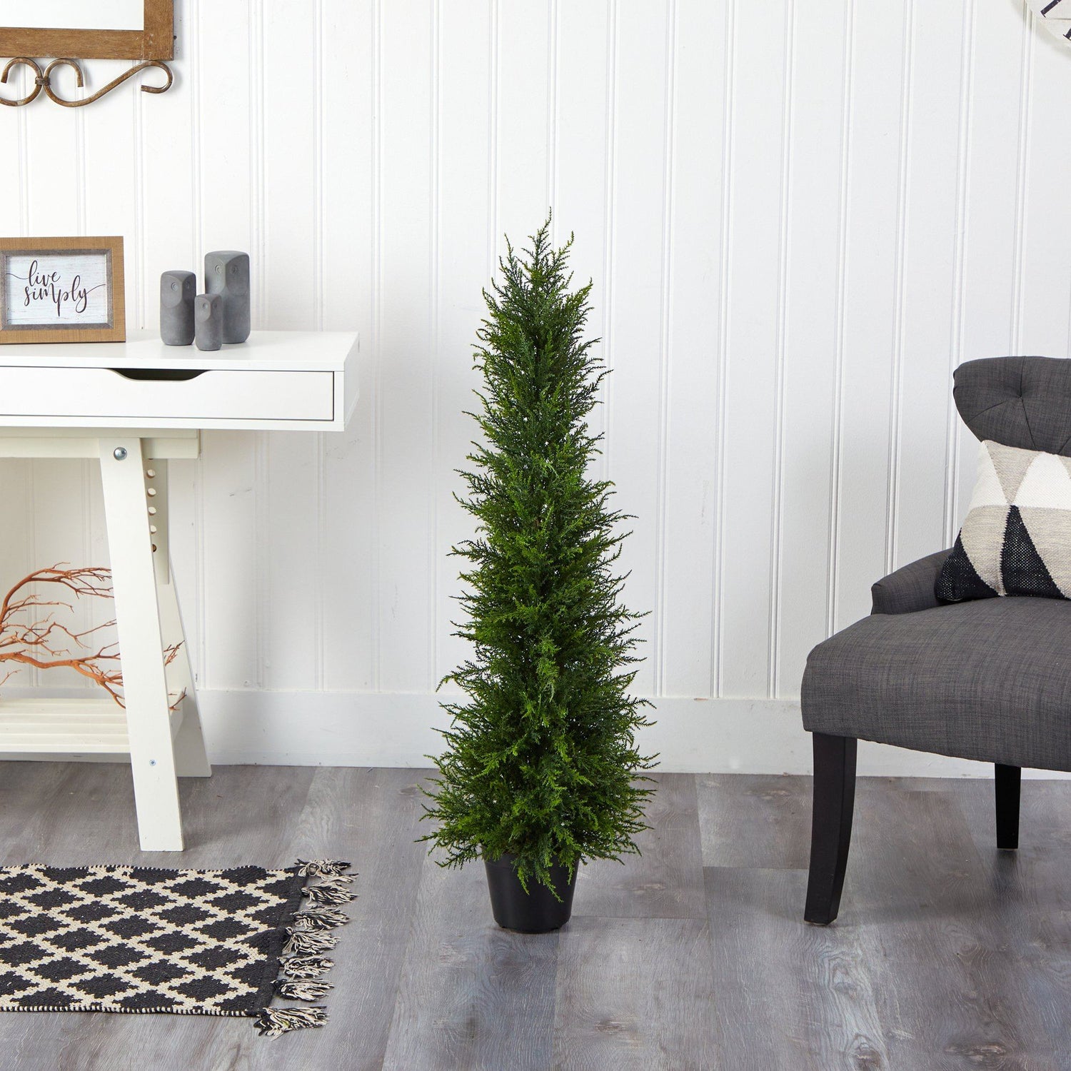 Transform your space into a cozy oasis with this Cypress Artificial Tree. Realistic, well-groomed fronds are shaped into an attractive elongated shape for a polished look. Compact and narrow in design, you can place safely in any indoor/outdoor space with its UV resistant feature. Standing 3.5' from a nurery planter (included in height) bring the restaurant and European café look to your next dinner party. Place in your entryway, outdoor patio, or next to your sofa.