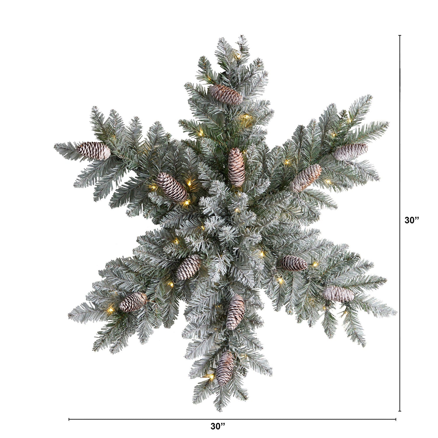 Have some whimsical fun this holiday season with a Pre-Lit Flocked Snowflake Artificial Dunhill Fir Wreath with Pinecones. Be bold and different by displaying evergreens in a star shape inspired by nature that mimics real trees' foliage and texture. Pre-lit with 40 LED lights that are more energy efficient create a cozy scene with the family. Pinecones adorn the 120 bendable branches for a rustic look. With a diameter of 30", house in any bare wall or door.