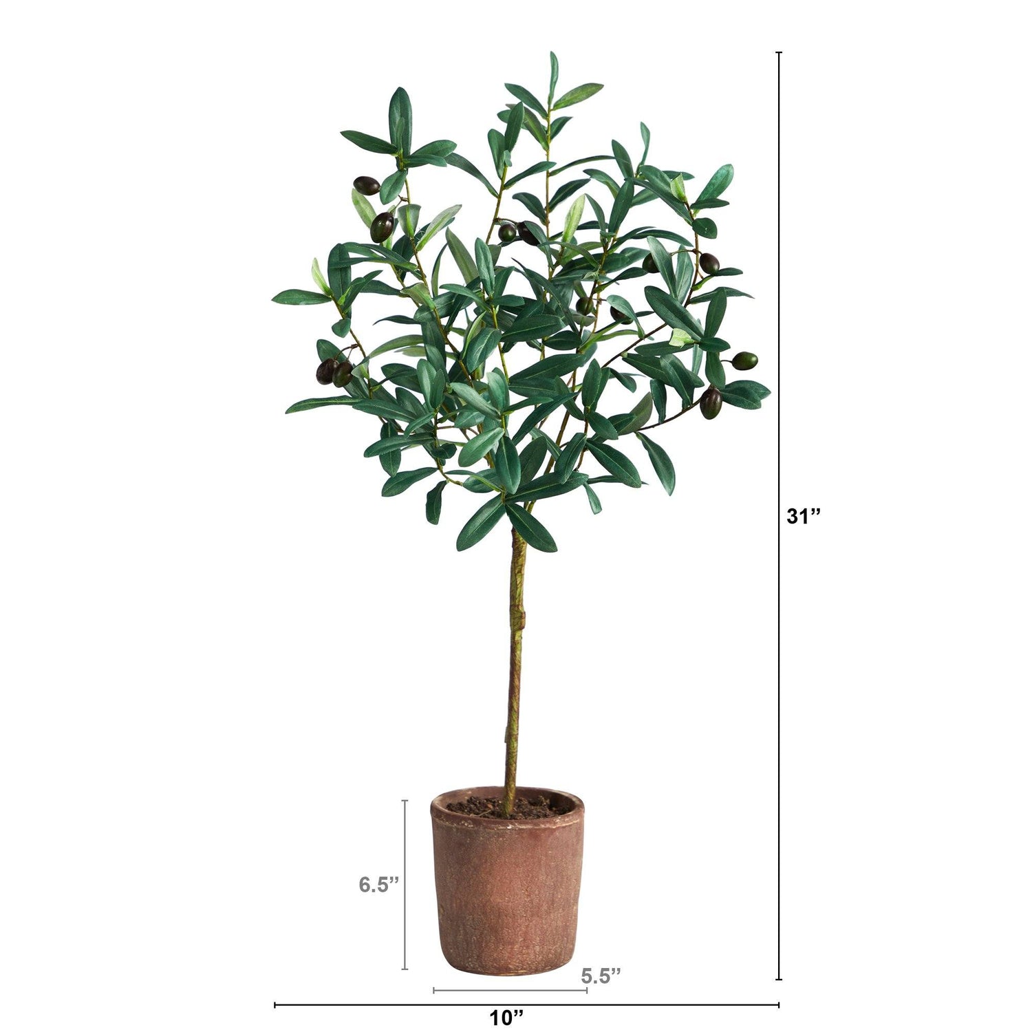 Walk through the Italian countryside with this fine and delicate Olive Artificial Tree. Featuring a thin brown trunk that splits into stems, this fake tree elegantly displays faux leaves and is accented throughout with fake olives so realistic that you’ll want to eat them. Standing at 31" from a planter (included in height), curate in compact and tight spaces like apartments, awkward corners, and bathrooms. This best-seller is perfect for minimalist, mid-century modern, boho and homes that need a delicate touch.