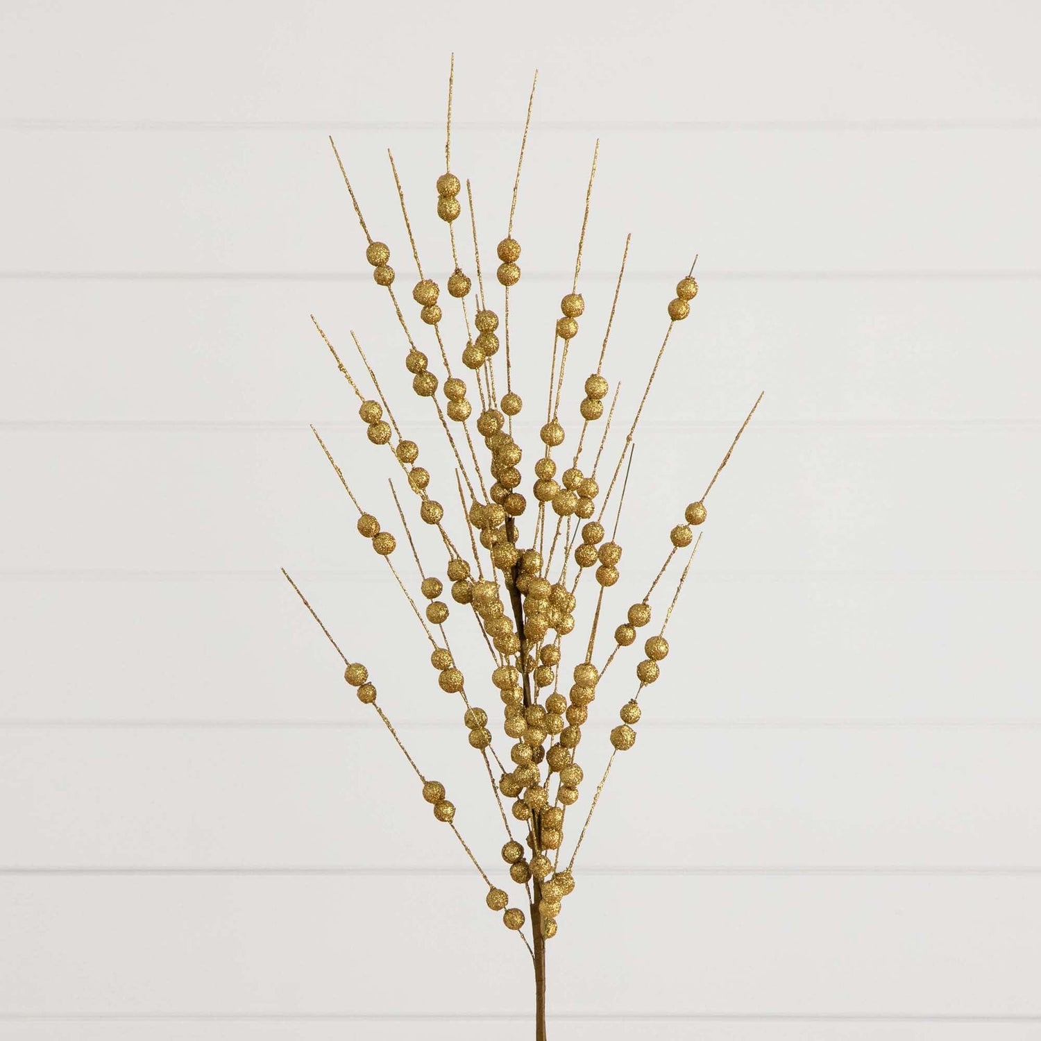 Stay in a golden state of mind this holiday season with the artificial berry stem in a gold finish. Perfect for holiday entertaining and inspired by the festive spirit, faux golden berries dangle from twig-like branches, adding a realistic charm. Christmas should be fun, and these faux stems boast a personality that transcends the season, making them ideal for year-round display. Feel free to DIY: trim, shape, or bend the wired branches to suit your style. At 36in from tip to base, this set will look berry excellent in any vase. Ideal for displaying in dining room for the season & beyond. Ideal for displaying in dining room for the season.