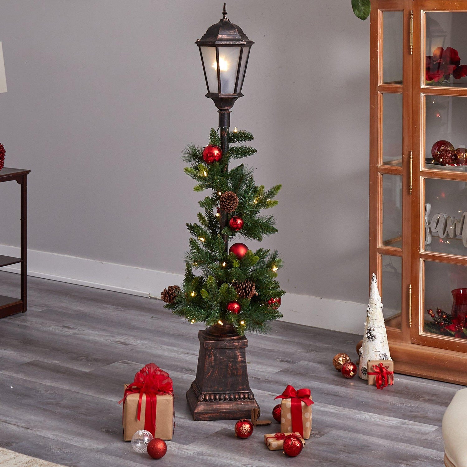 5' Holiday Decorated Lamp Post with Greenery, Ornaments and 50 LED Lights