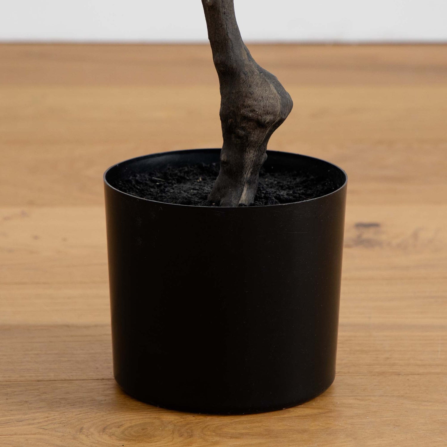 Walk through the Italian countryside with this fine and delicate Olive Artificial Tree. Featuring a thin brown trunk that splits into stems, this fake tree elegantly displays faux leaves and is accented throughout with fake olives so realistic that you’ll want to eat them. Standing at 5' from a nursery planter (included in height), curate in compact and tight spaces like apartments, awkward corners, and bathrooms. This best-seller is perfect for minimalist, mid-century modern, boho and homes that need a delicate touch.