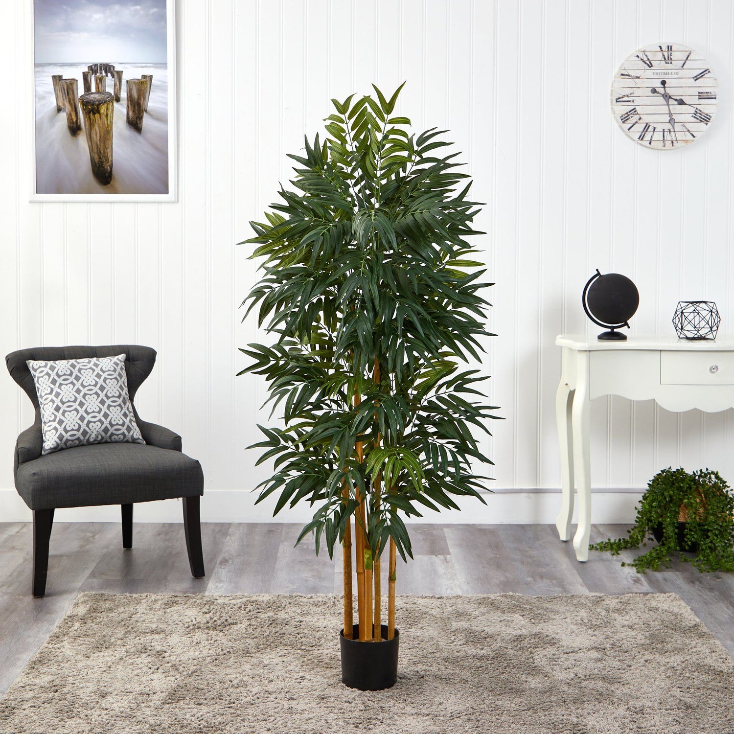 Cultivate lush greenery in your interior spaces with this Phoenix Palm Artificial Tree with a natural trunk. Boasting close to 1000 leaves from 8 real natural trunks, design a tropical paradise full of green, serene foliage that’ll freshen up any space. These happy splendors are iconic in the exotic regions of Europe, Africa, and Asia. Today, you can bring that aura to your living spaces - without a green thumb. Standing at 5’, including the black planter, this palm tree makes a sultry backdrop in homes or offices. Turn your space into a summer oasis by curating in clusters.