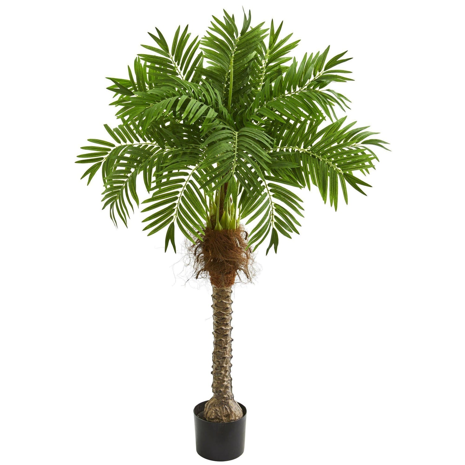 Standing at an impressive height of 58 inches, this Robellini palm artificial tree will be a stunning decor piece to add to your sun room or living room setup. It features a thick, textured trunk topped with deep green leaves that elegantly splay outwards. If you choose to place it in your living room, then position it in a corner behind your mellow couch next to a decorative floor lamp for a classic finish.