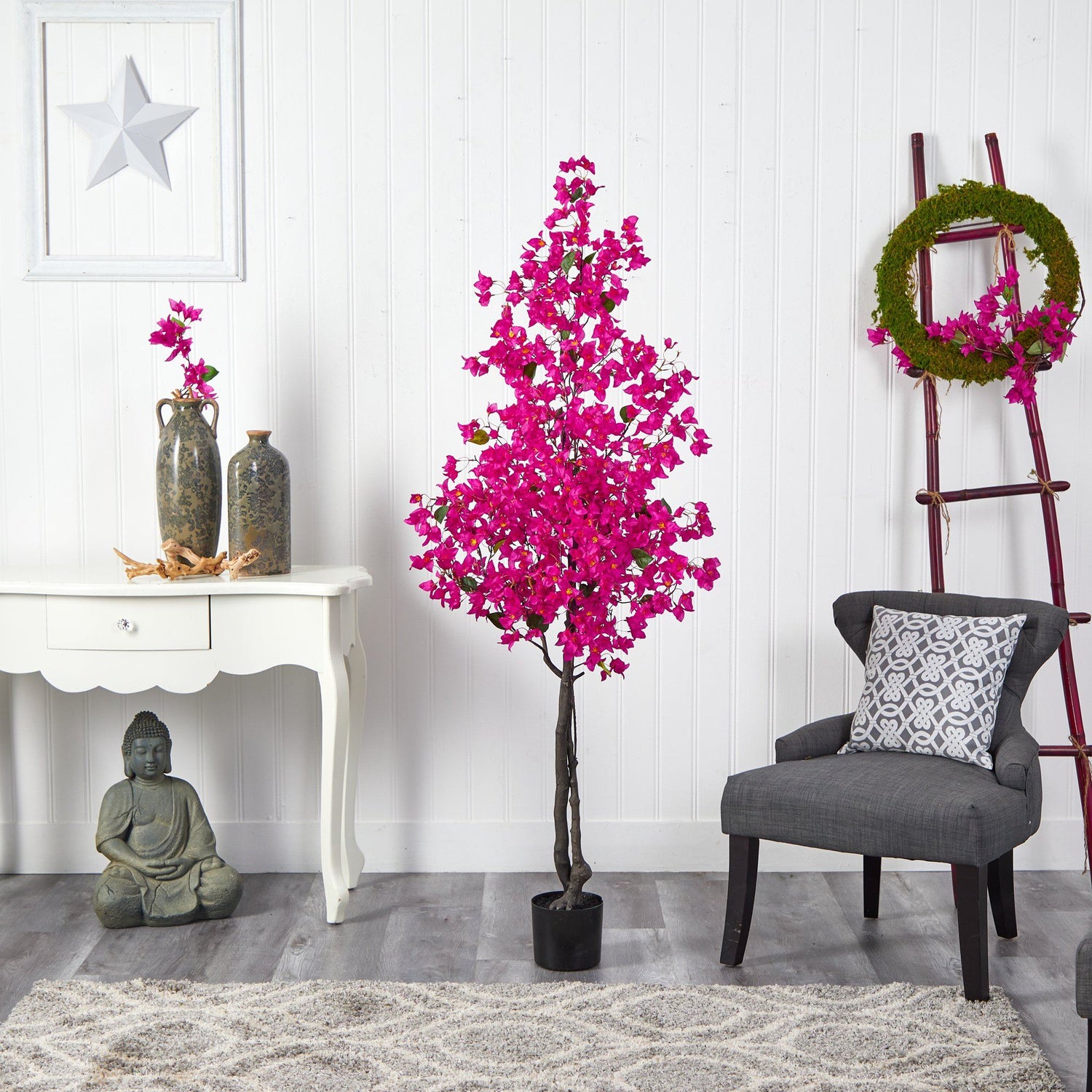 If you feel like showing your true colors, feel pretty in pink with this Bougainvillea artificial tree. A palette of vivid colored flowers stem from a realistic brown trunk. Inspired by nature, the lifelike flowers will brighten and refresh any corner. Standing at 6', from a nursery planter, bring a feminine touch with vibrant flowers. Designed and approved by horticulturists, display in any room that needs to bloom such as bathrooms, home offices or kitchens.