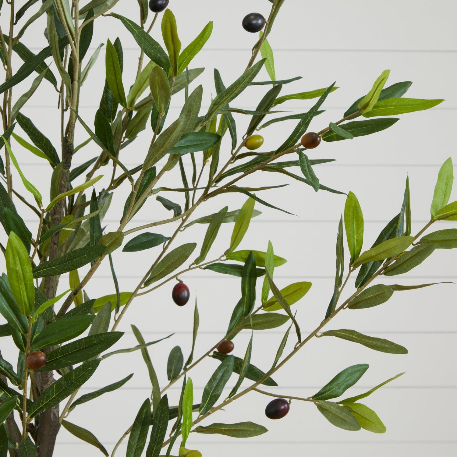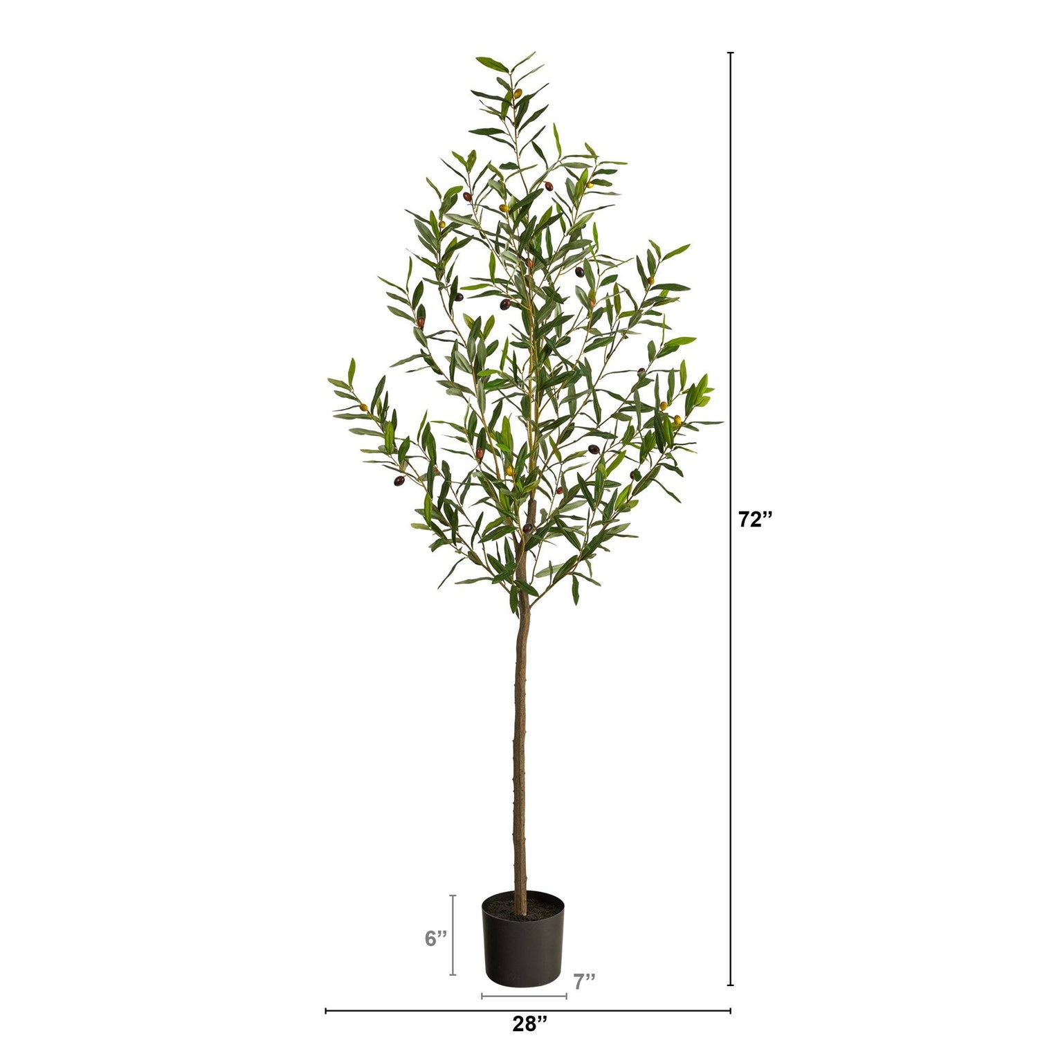 Walk through the Italian countryside with this fine and delicate Olive Artificial Tree. Featuring a thin brown trunk that splits into stems, this fake tree elegantly displays faux leaves and is accented throughout with fake olives so realistic that you’ll want to eat them. Standing 6' from a nursery planter (included in height), curate in compact and tight spaces like apartments, awkward corners, and bathrooms. This best-seller is perfect for minimalist, mid-century modern, boho and homes that need a delicate touch.