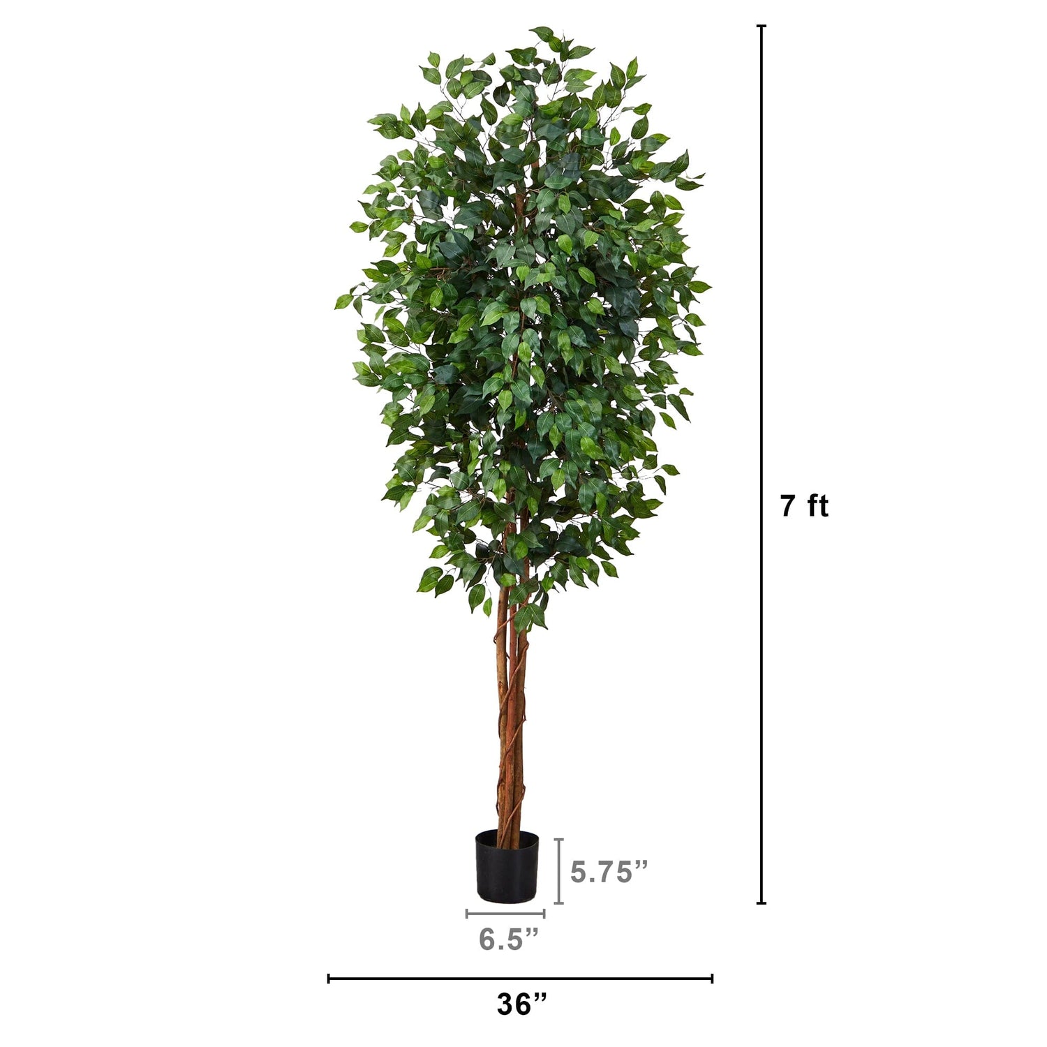 Unlike the real Ficus tree (which is finicky and practically leafless in almost any home light conditions), our Ficus tree is eternally verdant and deep green with 1260 individual leaves on several sturdy branches. Measuring seven feet in height, this wonderful reproduction Ficus would look lovely in a picture window, home entranceway, or even the office.