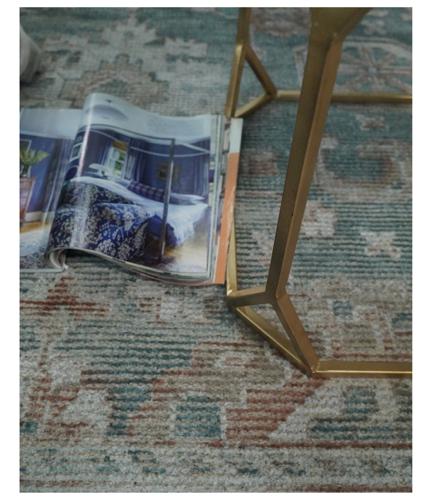 This handmade area rug is made with fine wool blended with art silk. The rug is sheered to a low pile to avoid any shedding and give it a unique abrushed texture. The design is hand-printed using a screen printing technique.