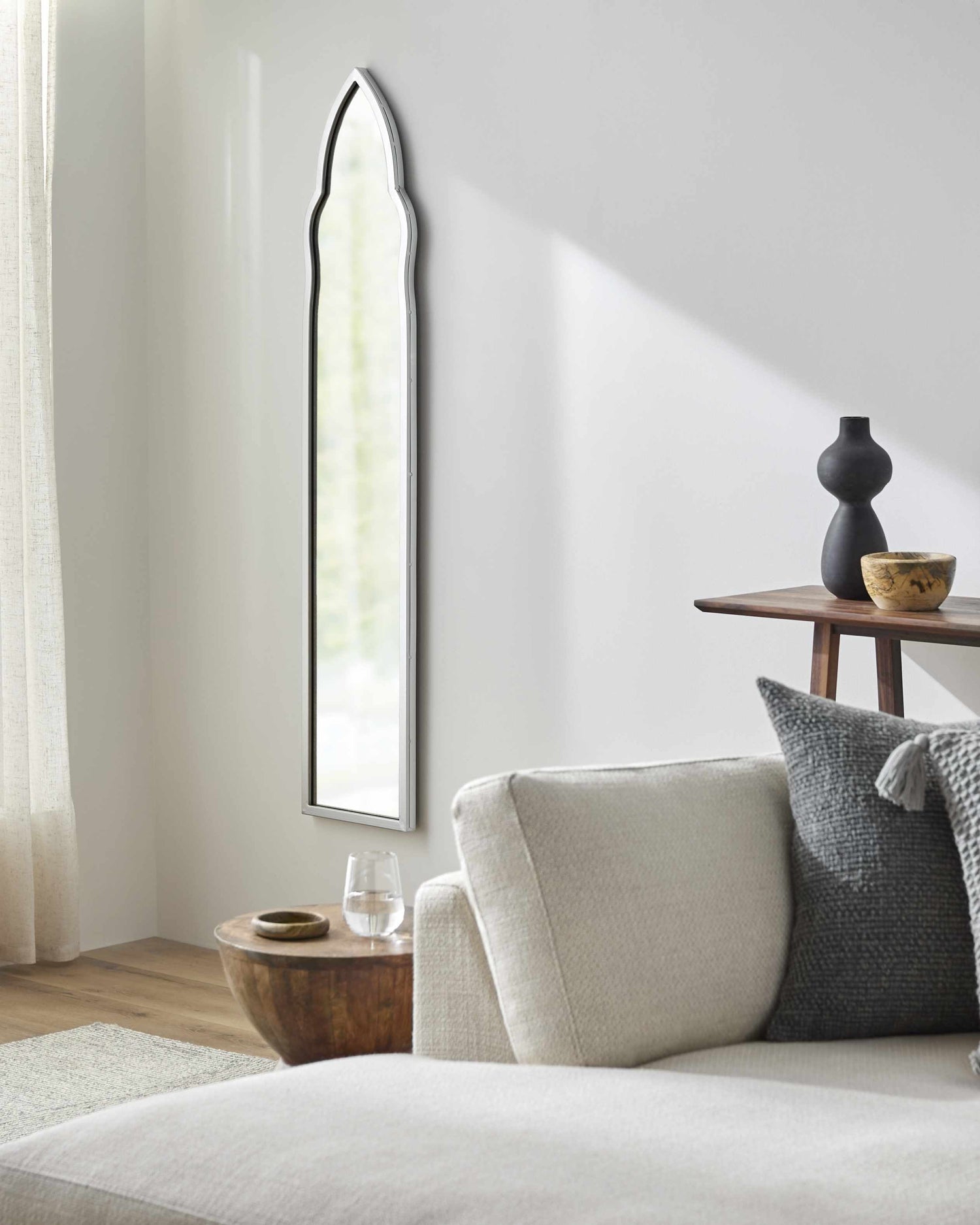 The Angad Mirror features a traditional design with a silver gray iron frame, combining durability with classic style. Its construction ensures stability and a refined look suitable for various interiors.