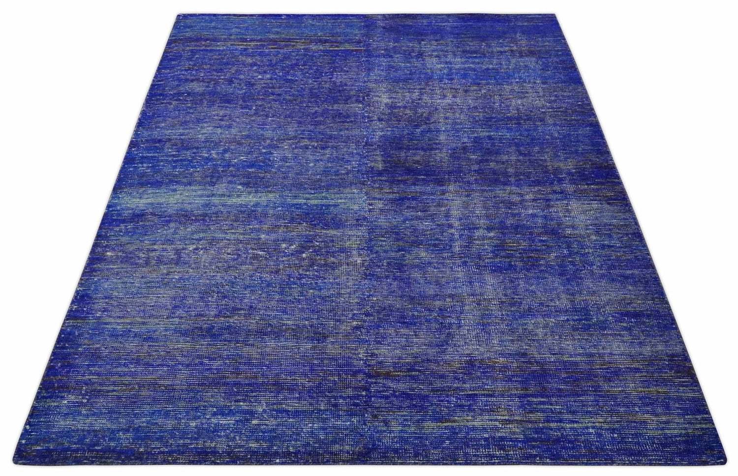 This modern and abstract hand-knotted area rug features a beautiful blend of blue and charcoal tones, creating a unique and eye-catching design. Made from soft and durable wool, this 8x10 flat woven rug is not only stylish but also provides comfort and longevity. Enhance your space with this statement piece.