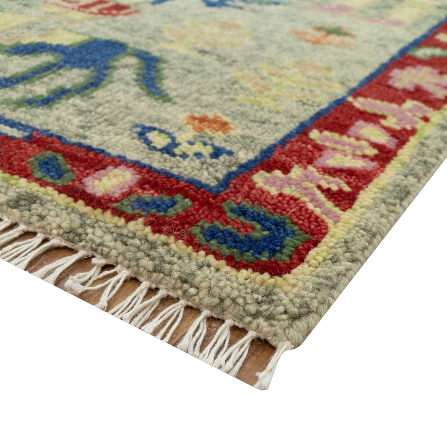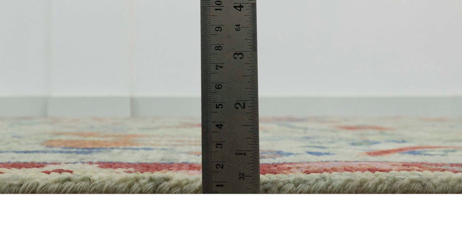 Expertly crafted from 100% wool, this custom-made area rug features a beautifully hand-knotted design in shades of green beige, rust, and blue, showcasing traditional folk art elements. Experience the luxurious softness and durability of wool while adding a unique touch to your decor.