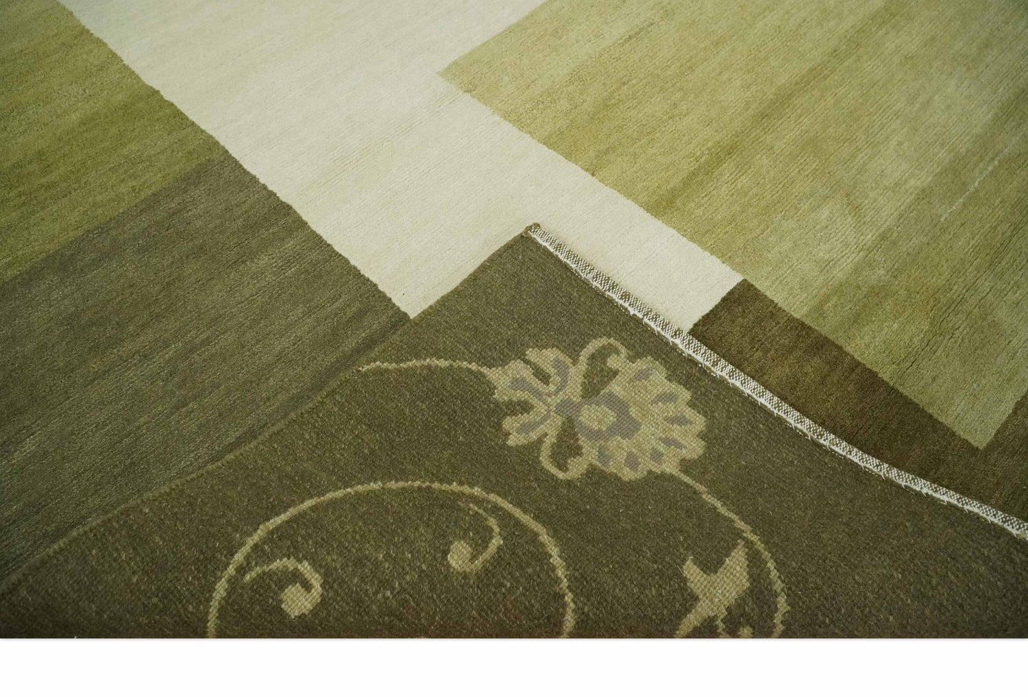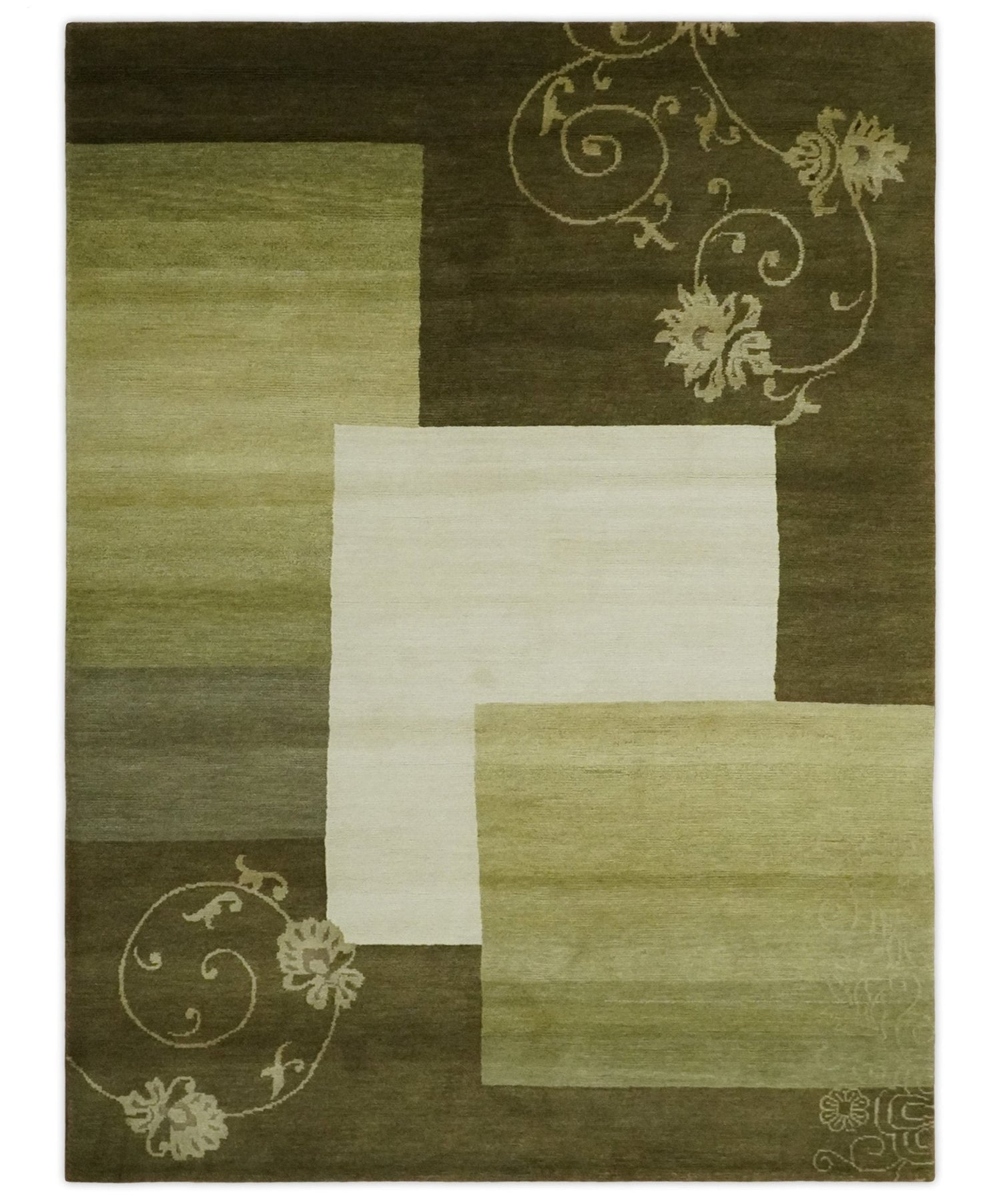 Geometrical Olive and Ivory Floral design Hand knotted 6x8 wool and Art Silk Area Rug
