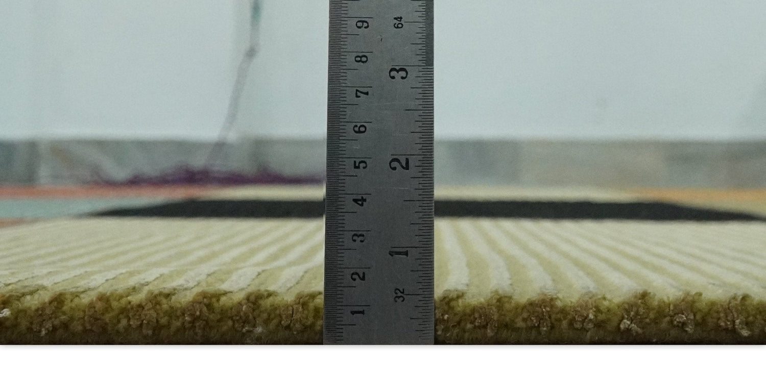 Enhance your space with our modern hand-knotted wool area rug featuring a stylish geometrical square shape and a unique striped texture in black, olive, rust, and silver. Expertly crafted for lasting durability and sophistication. Available in 5x8 size. Modernize your home today.