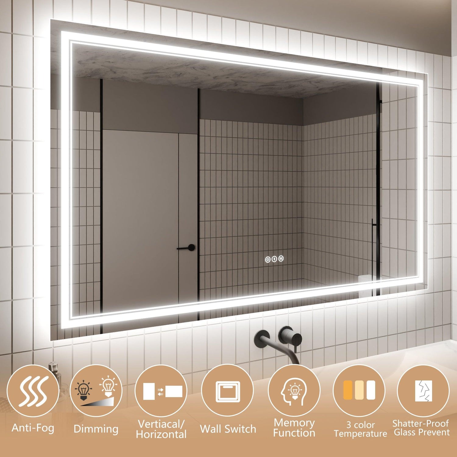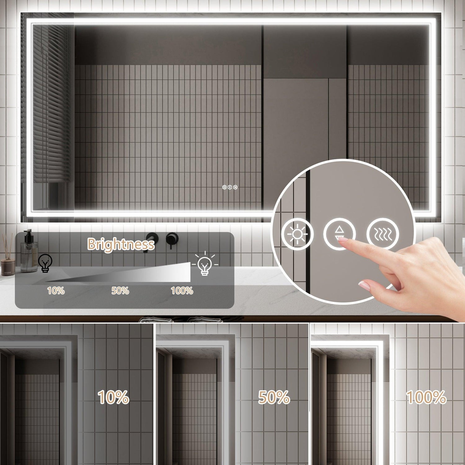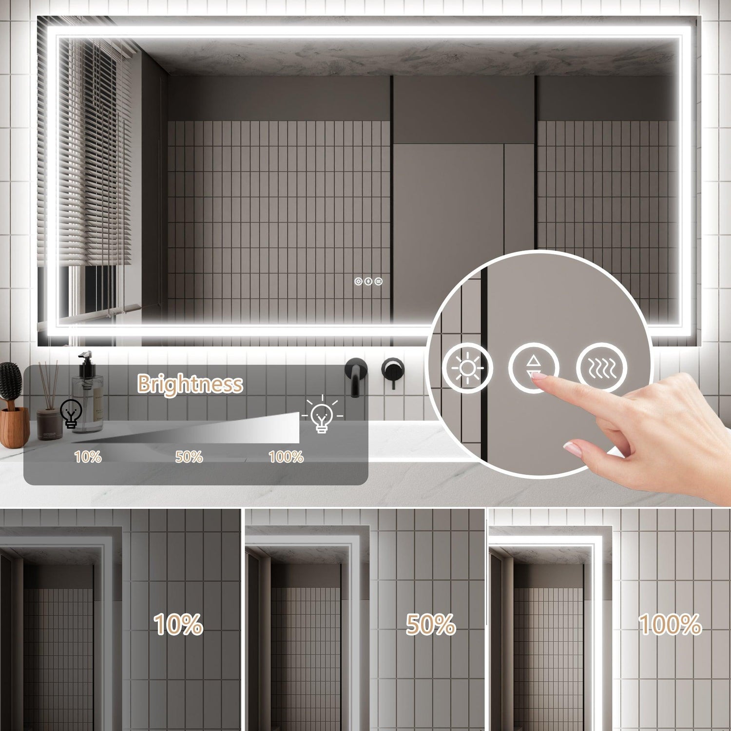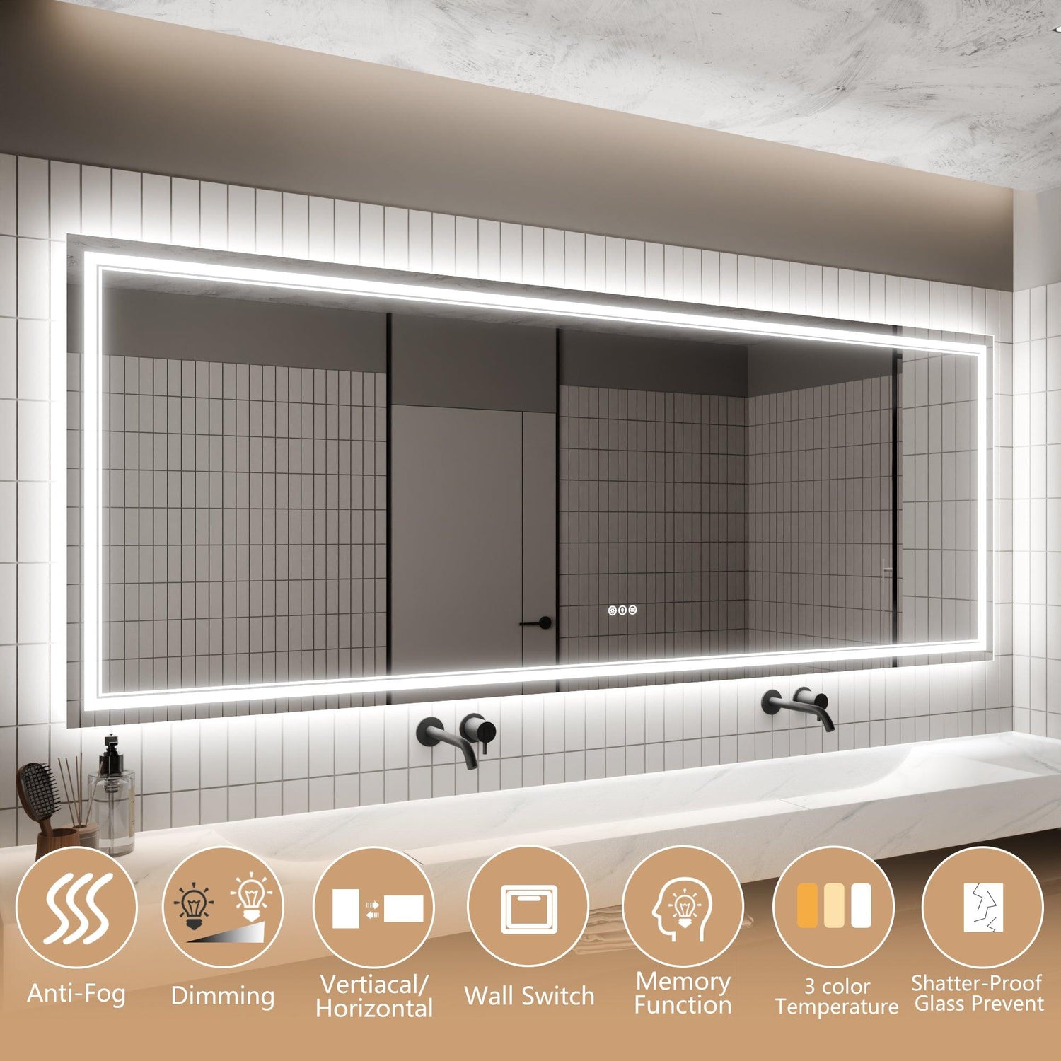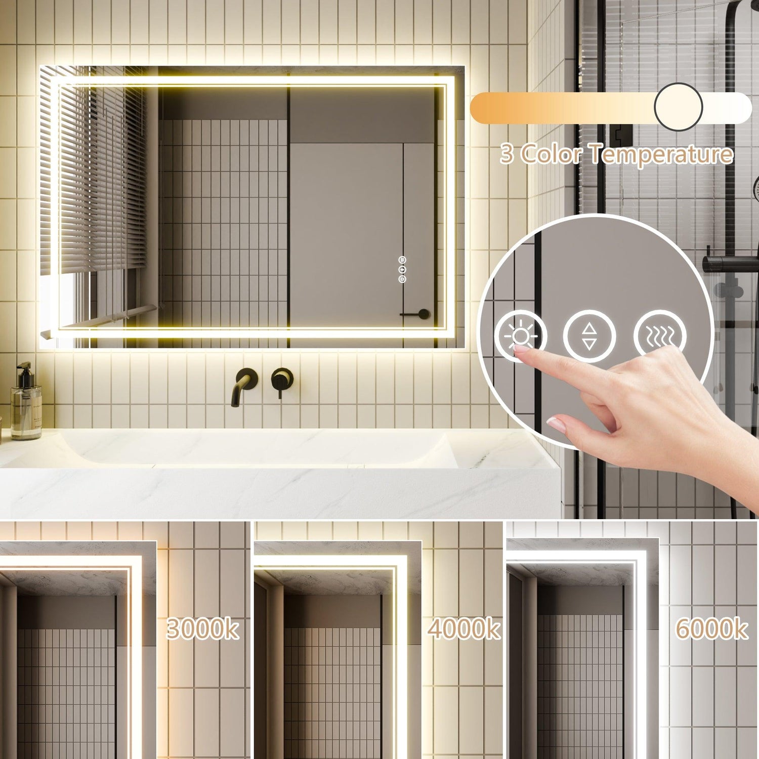 【Memory Dimming Button】: This mirror features a touch-sensitive dimming button that allows you to smoothly adjust brightness across the full range. The system remembers your last brightness setting for effortless daily use. Additionally, a single click cycles through three LED color temperatures—Warm (3000K), Daylight (4500K), and White light (6400K)—to suit your preference or task. Support for wall switch control on/off adds further convenience.
