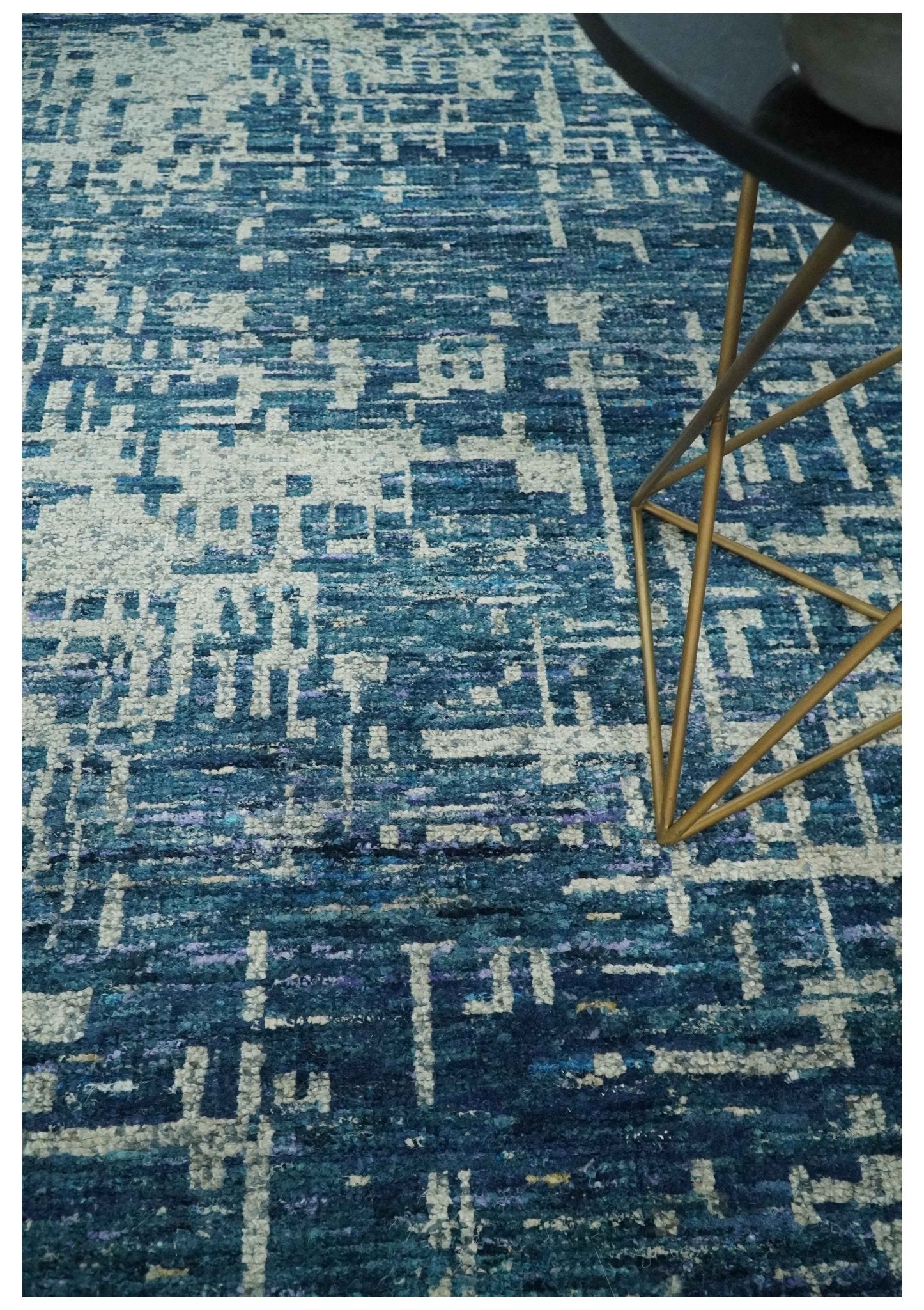 Hand Knotted Blue and Beige Modern Abstract Contemporary Recycled Art Silk Area Rug
