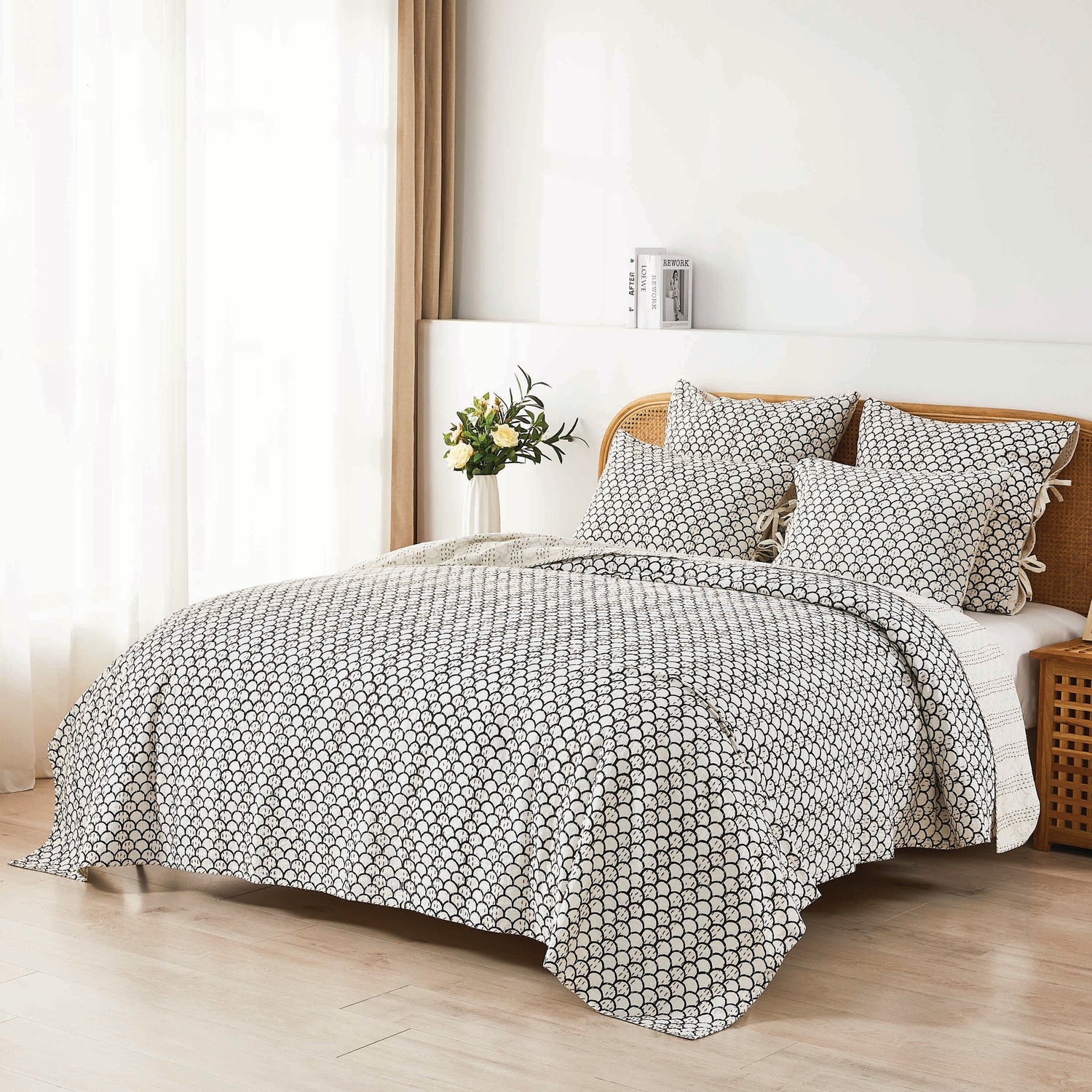 Our handmade coverlet features traditional Indian block prints.  The cotton fabric is stitched by hand to create a unique, lightweight layer.  Due to the handmade nature of this coverlet, variations will occur in the printing and stitching.
