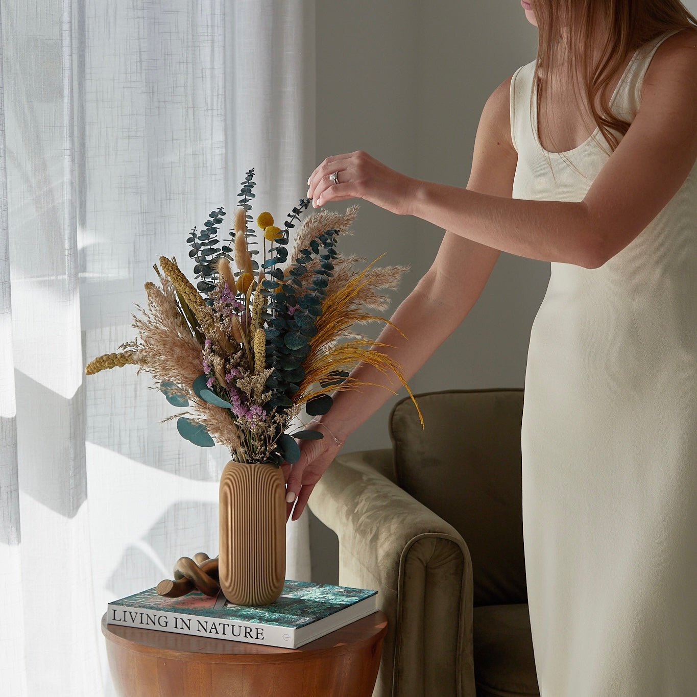 Composition: dried pampas grass in brown and golden natural, preserved eucalyptus mix in blue, natural limonium, billy balls in yellow, and more.