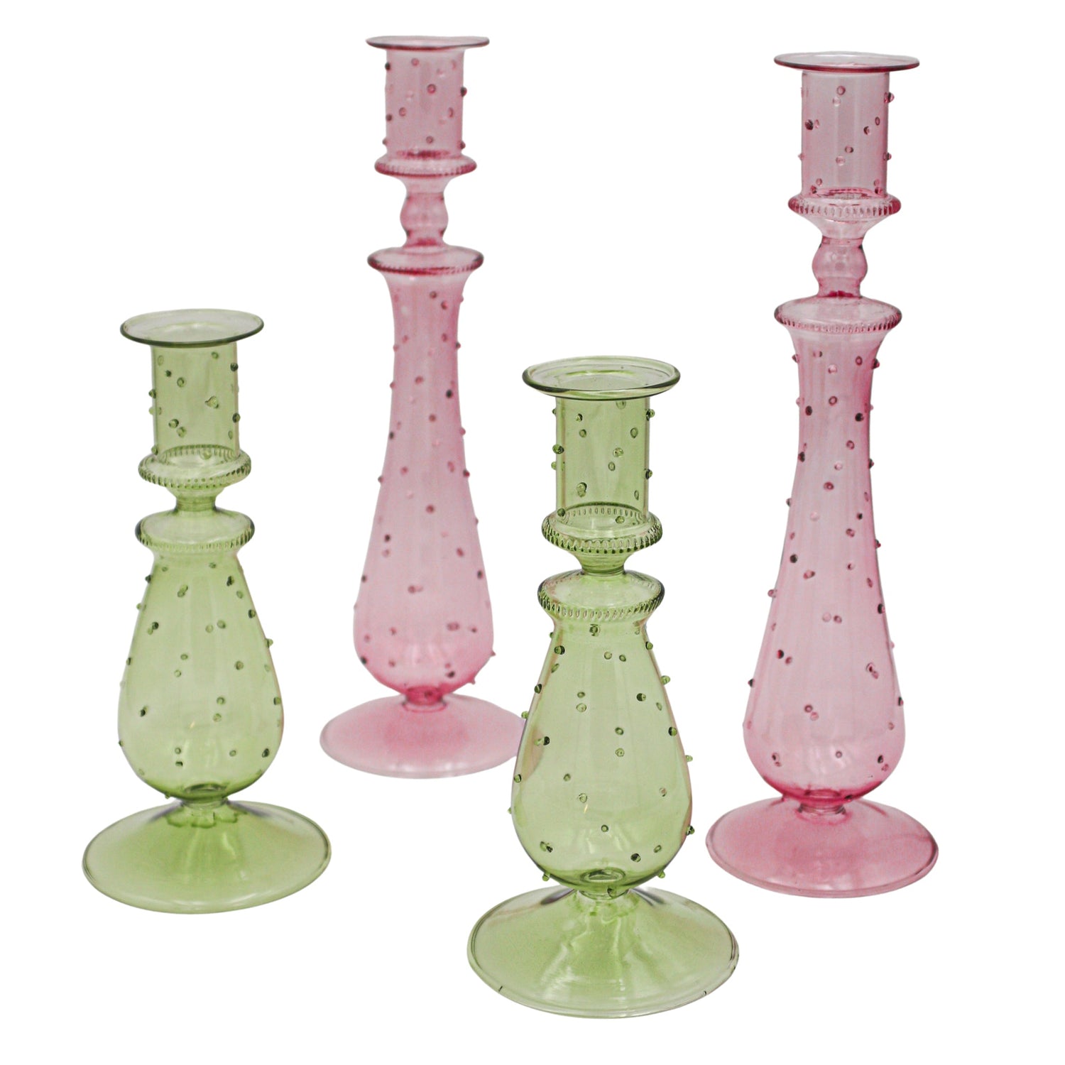 A duo of pink-hand blown fluted candle holders with spotted details.
