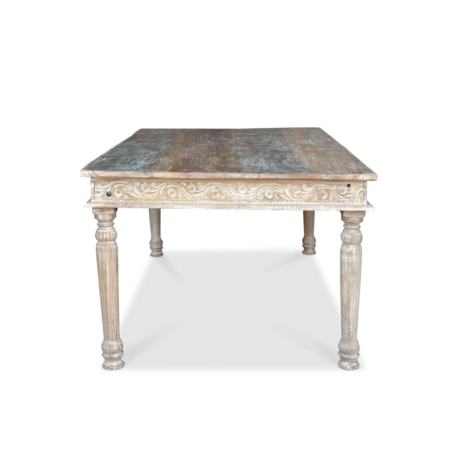 Elevate your dining experience with this exquisite reclaimed wood dining table. Crafted from light-colored wood with a rich natural finish, this piece is a versatile addition to any home decor. The intricate carved details add a touch of vintage elegance, making it a true masterpiece. Hand-crafted from high-quality timber, our dining table is built to withstand frequent use and retain its impeccable industrial, rustic, and vintage charm.
