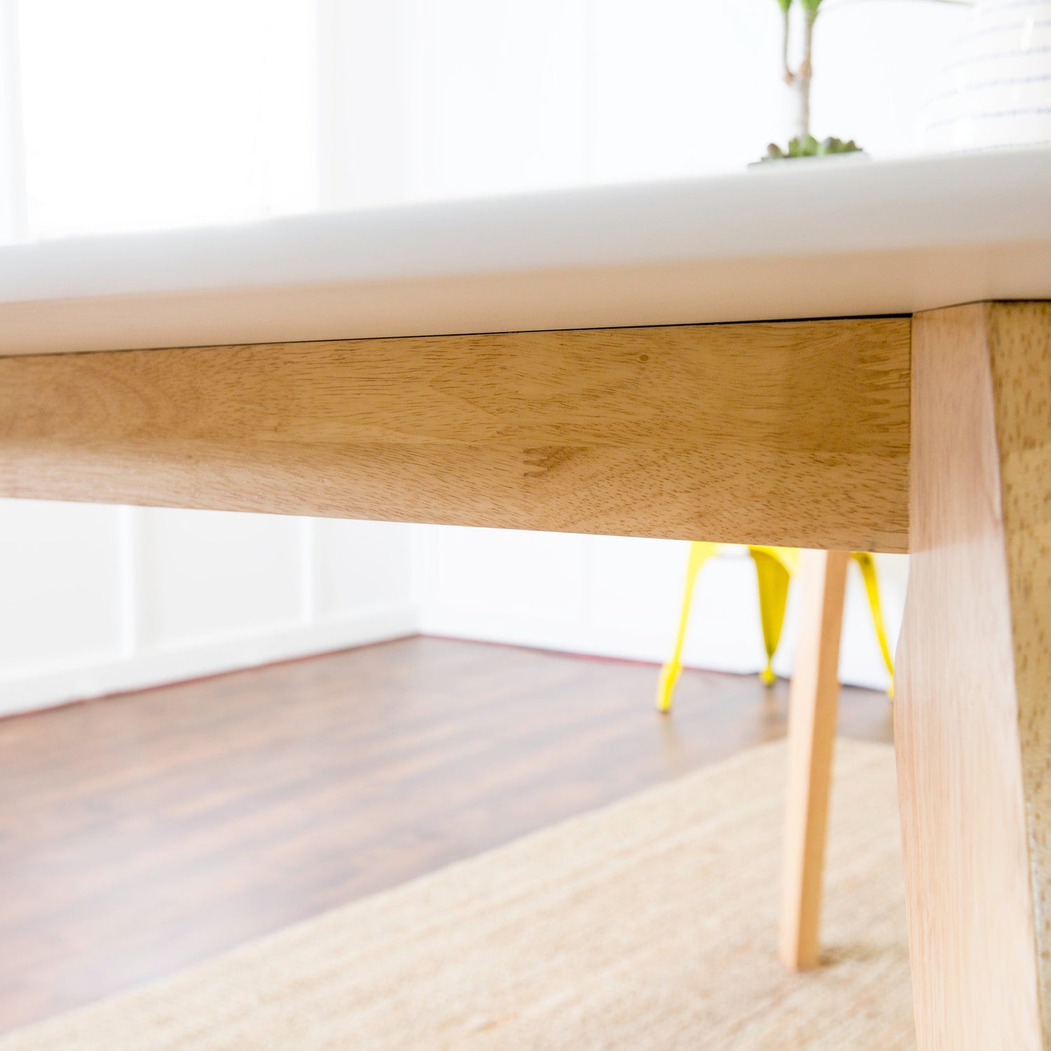 This Mid-Century Retro Modern Dining Table features a painted white tabletop paired with natural solid wood legs, seamlessly blending classic design with contemporary form. Its versatile size accommodates up to six chairs or five chairs with a bench, making it ideal for both intimate family meals and larger gatherings. Crafted to enhance any kitchen or dining room with clean lines and durable materials, this table balances aesthetic appeal with functional comfort.