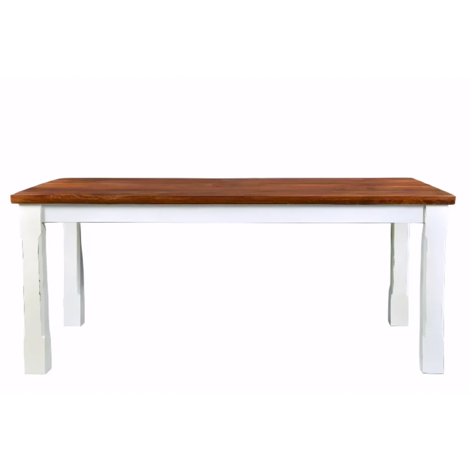 Indulge in luxurious rustic charm with our MYSORE FARMHOUSE CHIC dining table, exuding artistic integrity. This exquisite piece features a solid Acacia wood table top resting on a sturdy white solid wood base, creating a subtle yet striking contrast. Crafted from reclaimed hardwood, this table is built to withstand the test of time. Create your own bespoke nook with this stunning addition to your home. Complete the look with our complementary chairs and benches from the collection.