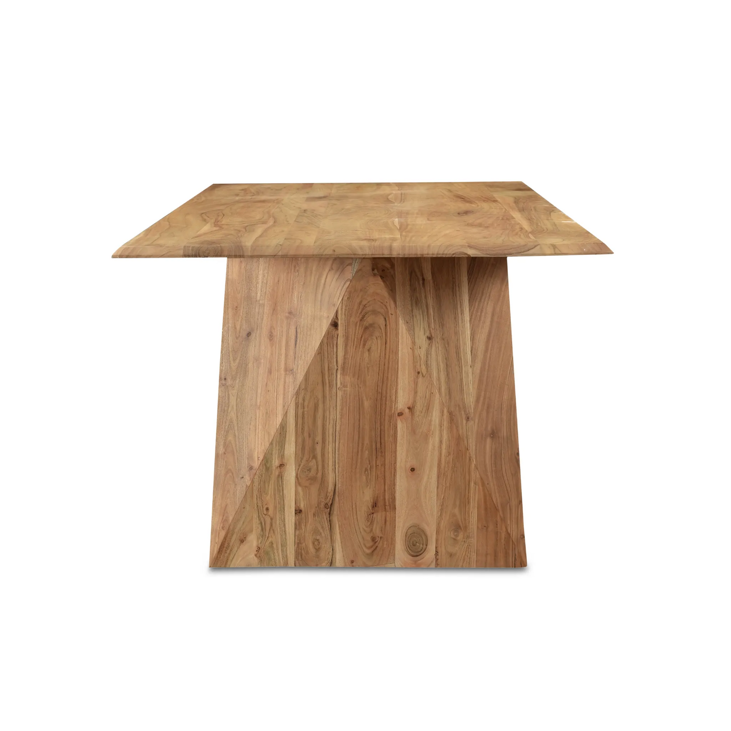 Our Solid Wood Angled Leg Dining Table - 80 Inch is expertly crafted from durable Acacia wood, showcasing the beautiful natural grain. This modern twist on the traditional farmhouse table is perfect for hosting family dinners, game nights, and more. Each piece is unique due to the natural variations in wood color and grain, making it a truly one-of-a-kind addition to your home. Made from kiln-dried solid acacia wood, this substantial table exudes elegance and sophistication.