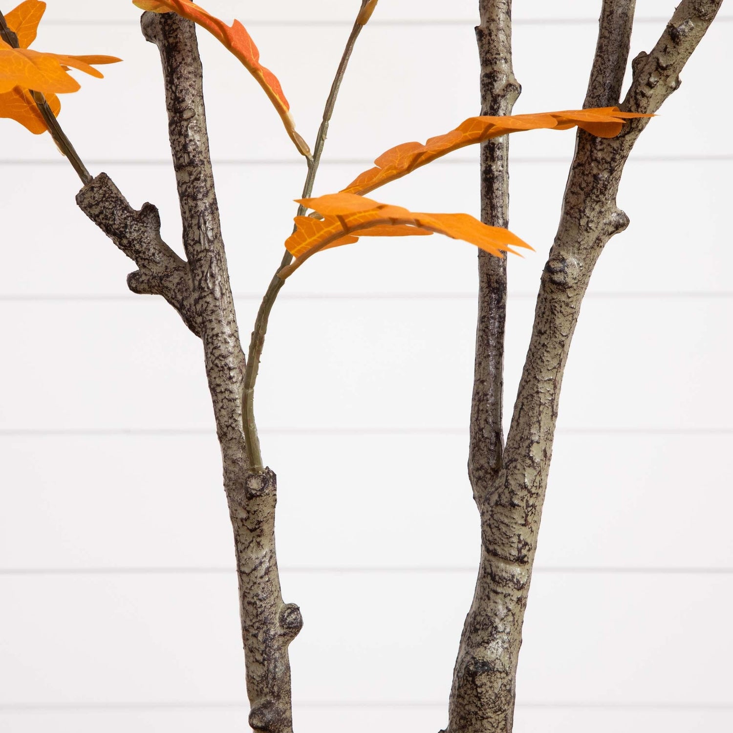 Bask in the glow of autumn with our lifelike oak tree. Each leaf is a burst of sunshine, capturing the essence of fall's golden embrace. The tree's trunk branches upward, supporting a cheerful canopy that seems to dance with the season's colors. Standing with elegance in its black nursery pot, you can even customize by adding the tree to your favorite planter and bring a cheerful, harvest-time serenity to any space. At just the right height of 6', it brightens up a dining room corner and delivers a welcoming touch in an entryway. This piece is a celebration of autumn's warm hues, without a single leaf ever tumbling to the ground.
