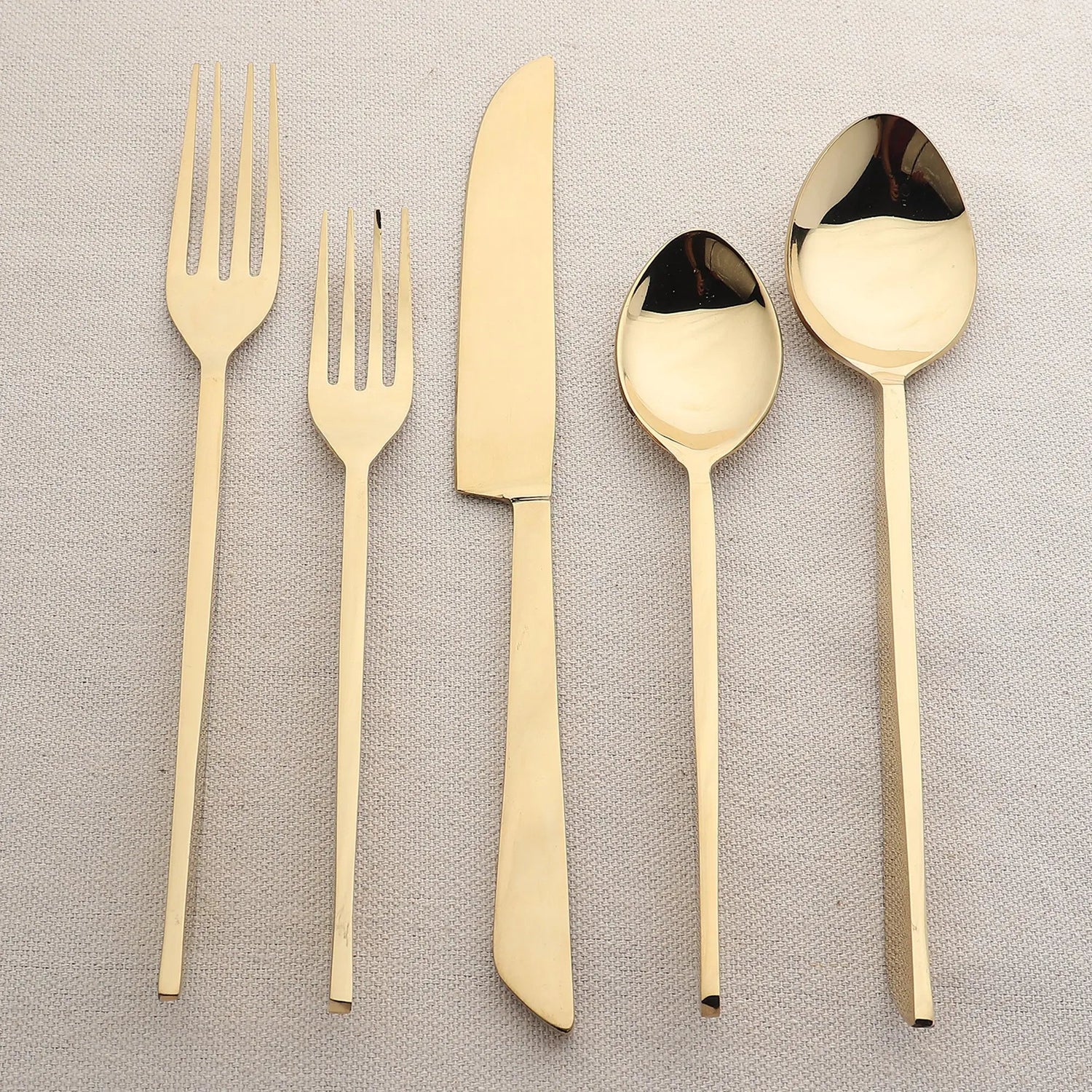 - 5-piece flatware set includes: 1 salad fork, 1 dinner fork, 1 knife, 1 soup spoon, and 1 teaspoon