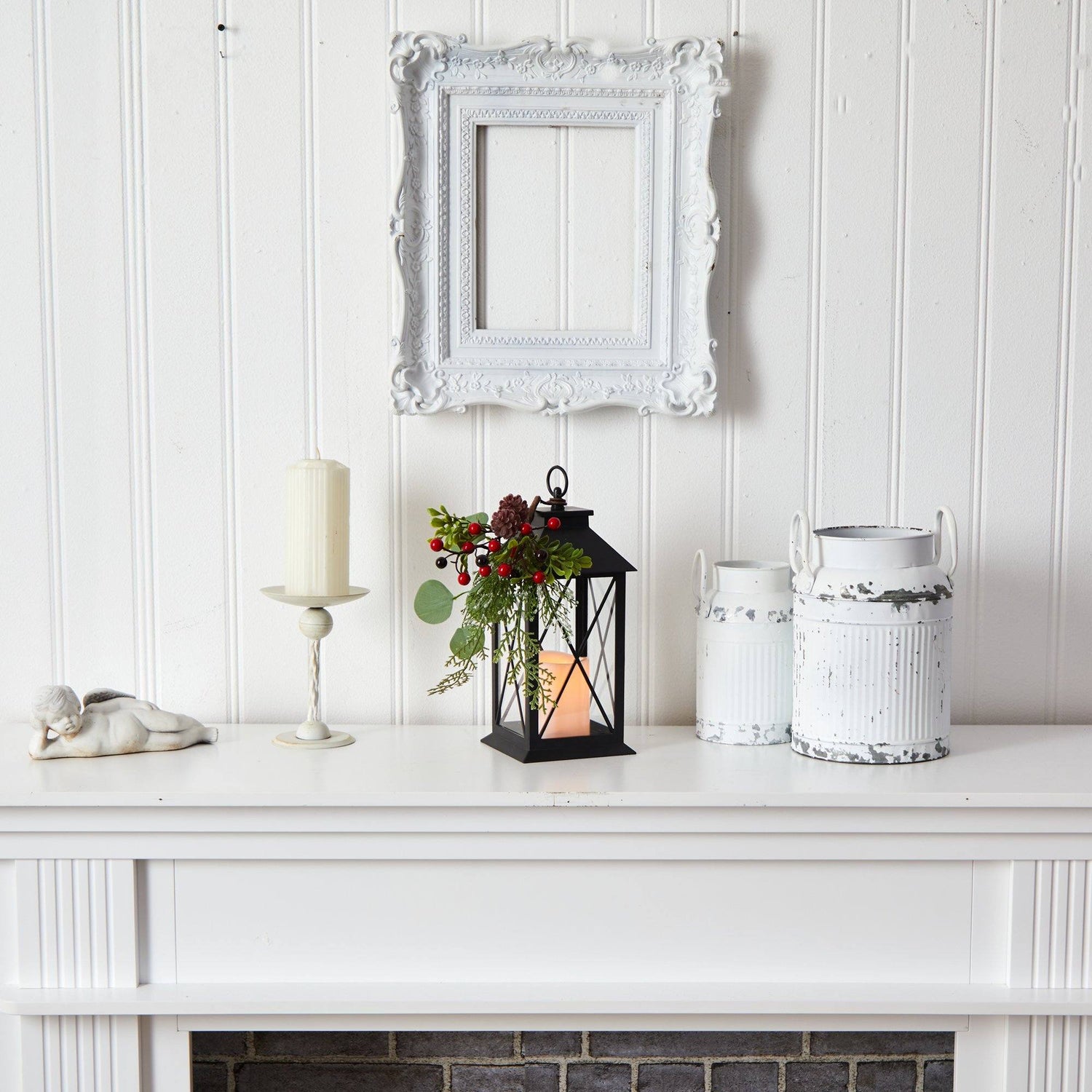 12" Holiday Berries and Greenery Metal Lantern Table Christmas Arrangement with LED Candle Included"