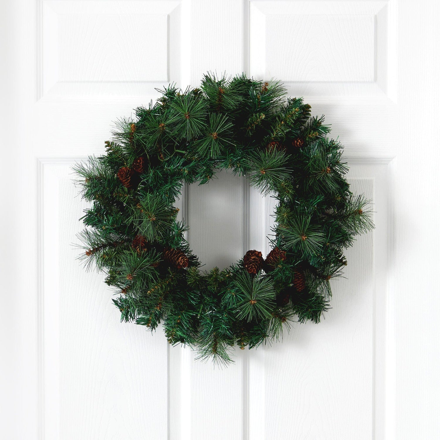 Light up your favorite seasonal accents while adding serious curb-side appeal with this artificial wreath intricately designed from a rich collection of seasonal evergreens in bright, rich hues, carefully accented throughout with faux pinecones that look incredibly lifelike. Arriving pre-strung with 35 clear LED lights to effortlessly illuminate either a wall or door, this 20” (in circumference) decorative wreath makes for an inviting accent and will undoubtedly transform any entrance all throughout the holiday season.