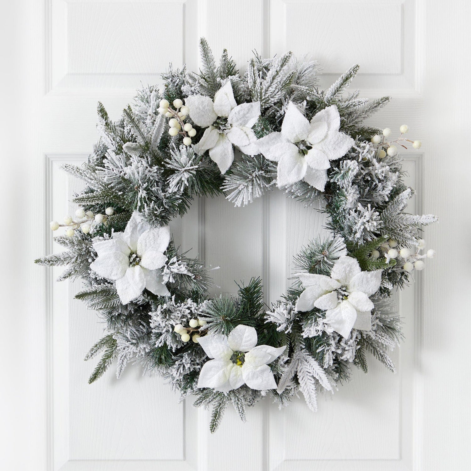 24” Flocked Poinsettia and Pine Artificial Christmas Wreath with 50 Warm White LED Lights