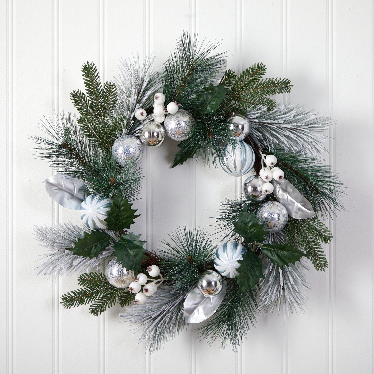 Update your favorite seasonal accents and add some curb appeal to your home or office entrance throughout the holidays with this artificial wreath intricately designed from rich, foliage in bright evergreens, handsomely accented throughout with faux pinecones and bright, red berries that look incredibly lifelike and silver ornaments. Great for seasonal display, this 24” (in diameter) decorative faux wreath makes for an inviting accent and will undoubtedly transform any home’s front-door appeal all throughout the season.