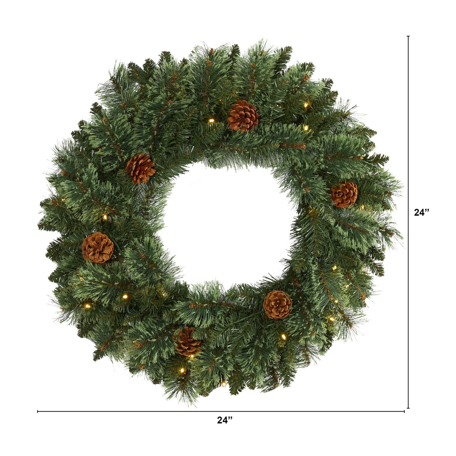 Light up your favorite seasonal accents while adding serious curb-side appeal with this artificial wreath intricately designed from realistic looking mountain pine foliage in a palette of seasonal evergreens, carefully accented throughout with faux pinecones that look incredibly lifelike. Arriving pre-strung with 35 clear LED lights to effortlessly illuminate either a wall or door, this 24” (in circumference) decorative wreath makes for an inviting accent and will undoubtedly transform any entrance all throughout the holiday season.