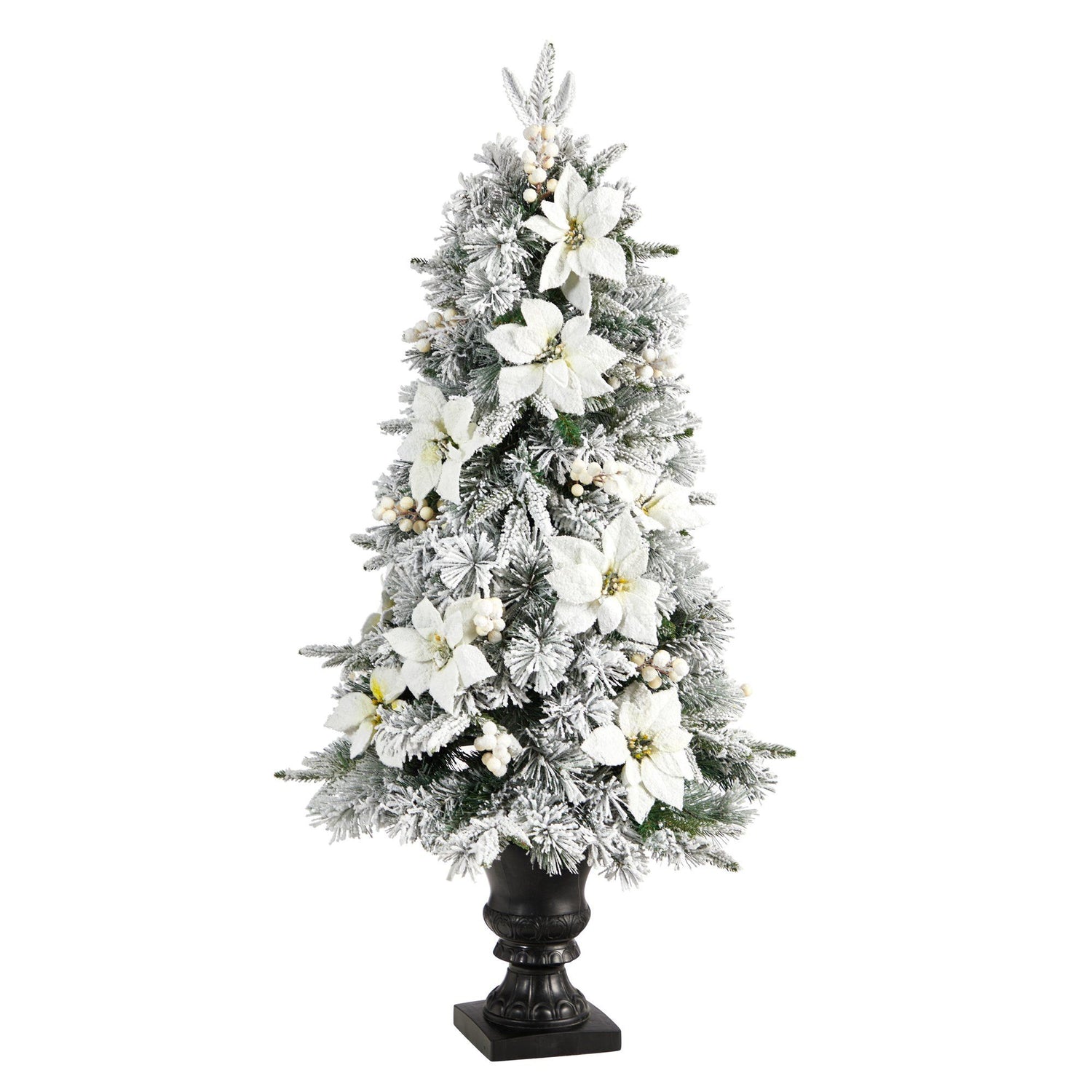 4’ Flocked Artificial Christmas Tree with 223 Bendable Branches and 100 Warm Lights in Decorative Urn