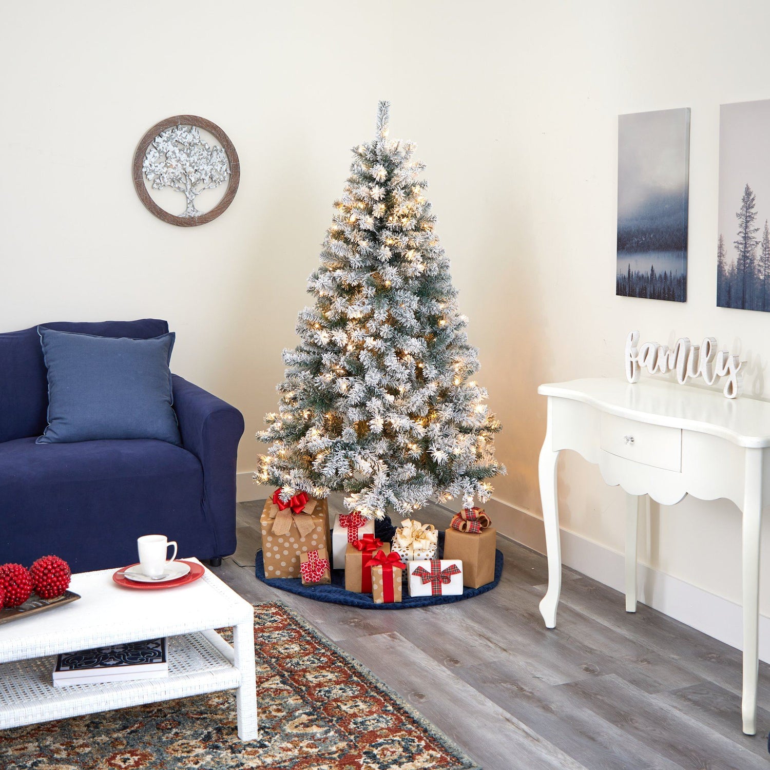 Create the ultimate winter wonderland scene in your home or office with the help of this Flocked Rock Springs Spruce Artificial Christmas Tree! Completely maintenance-free, this winter-inspired fake Christmas tree boasts an array of soft looking foliage, all beautifully flocked in a snow-like effect throughout its 586 bendable branches, perfect for accenting with your favorite holiday accents. Arriving pre-strung with 250 Clear LED lights to eliminate tangles and stabilized on an accompanying stand, this handsome 6’ tall artificial Christmas tree will not only make holiday decorating a breeze but ensure your home is always looking picture-perfect throughout the holiday season.