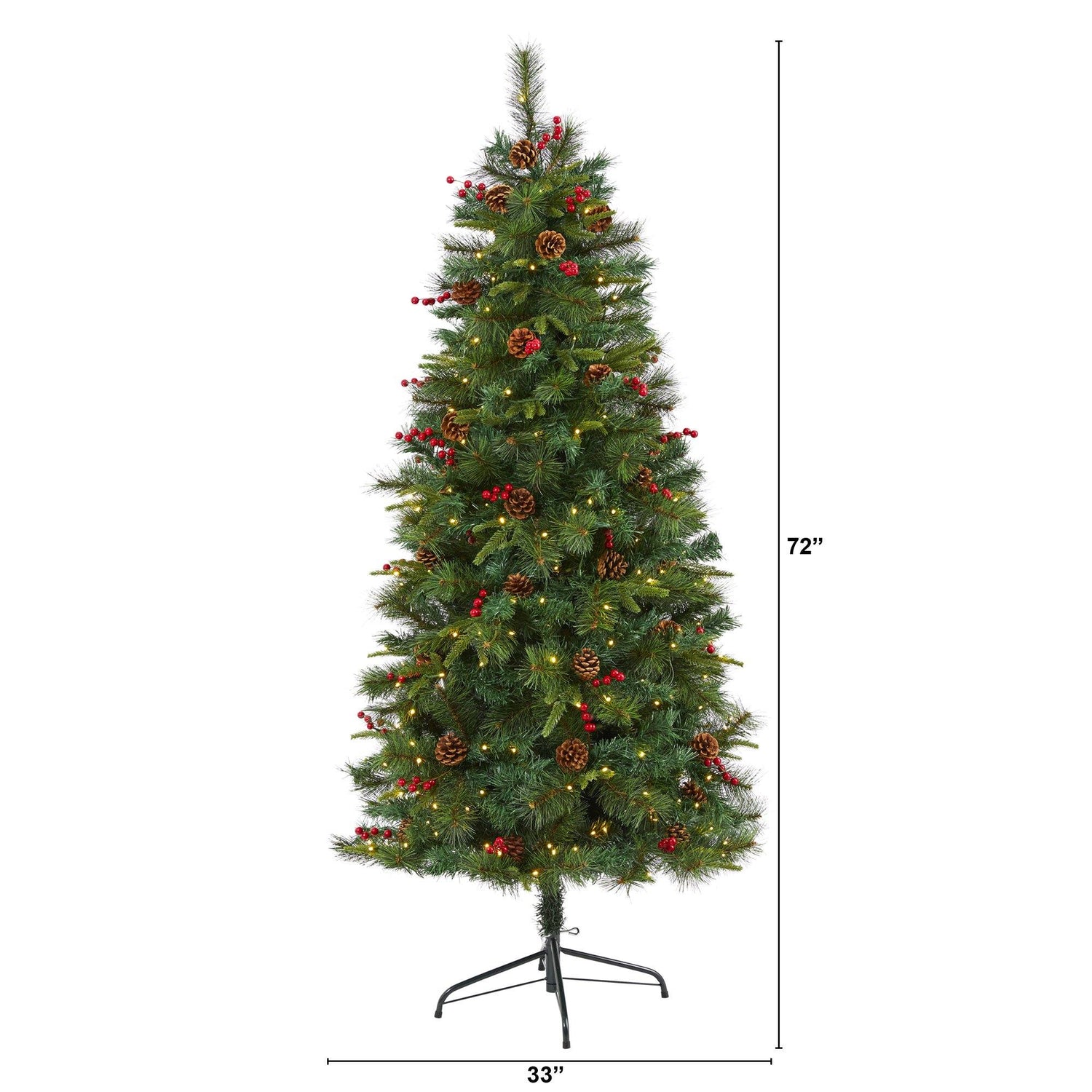 6’ Mixed Pine Artificial Christmas Tree with 250 Clear LED Lights, Pine Cones and Berries
